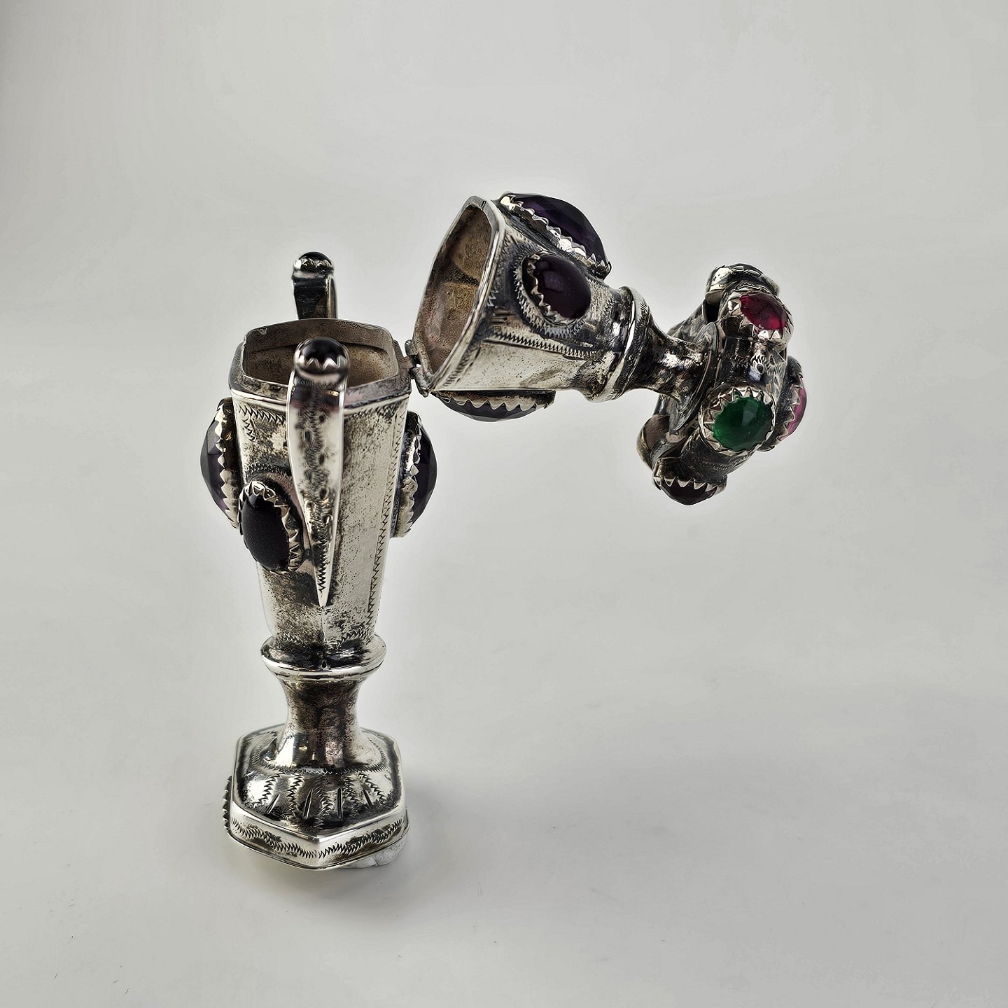 Hovedvandsæg i sølv dekoreret med forskellige smykkesten. Indgraveret under bunden med et hjerte, initialer og årstallet 1955Producent ukendt, stemplet muligvis CG