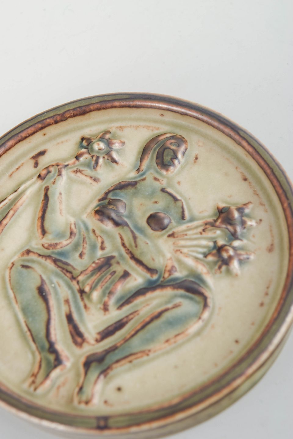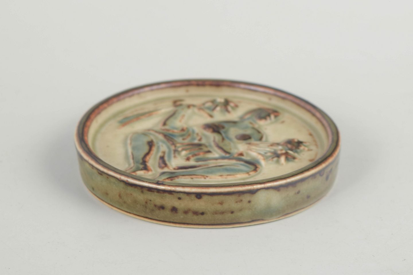 Jais Nielsen for Royal Copenhagen, miniature fad.Reliefdekoreret miniaturefad i glaseret keramik med figurmotiv, model 21175.