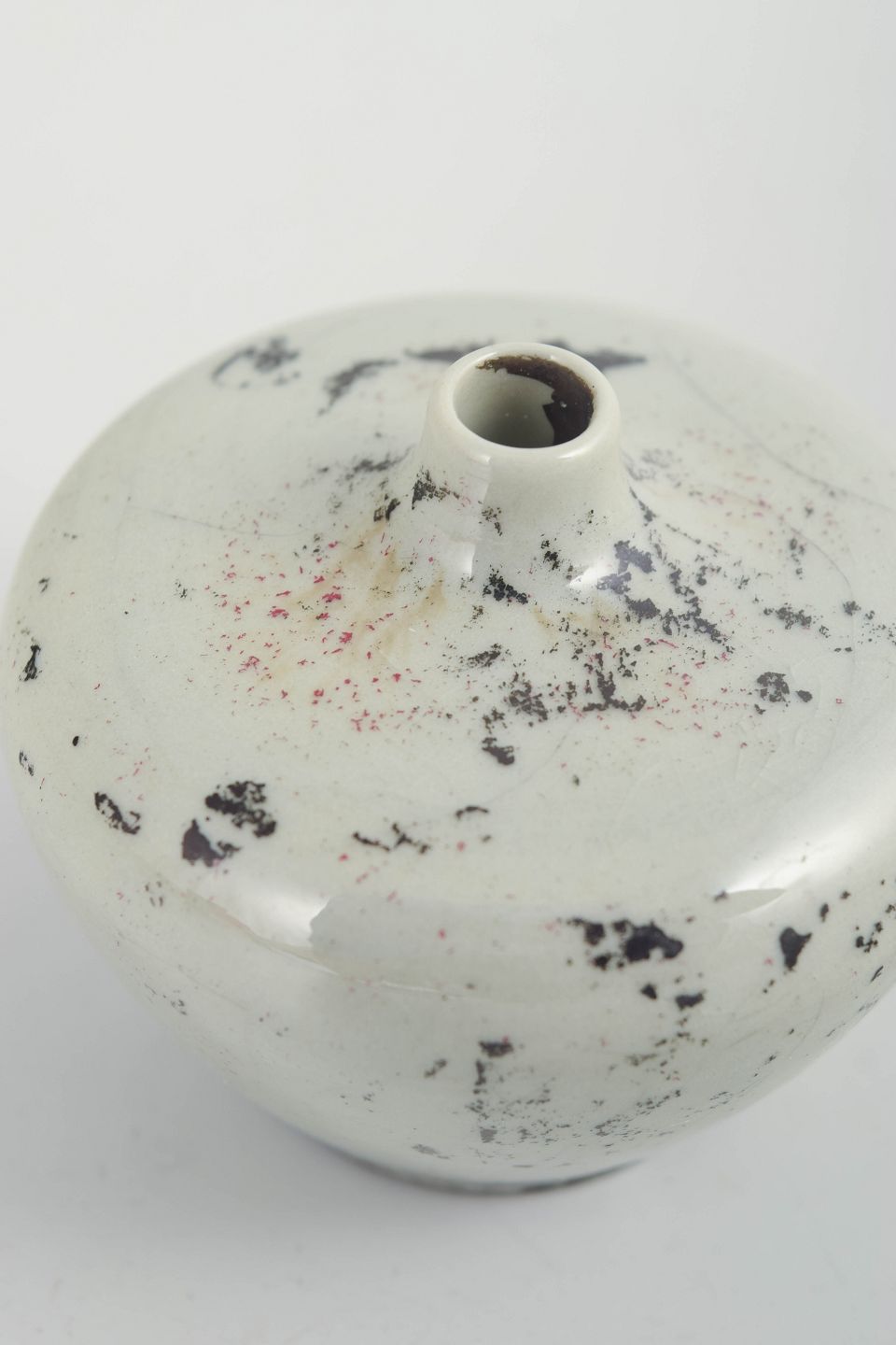 Carl-Harry Stålhane for Rörstrand, miniaturevase.Lille drejet vase i stentøj med lys cremefarvet glasur og spættet dekor i mørke toner, med blød, afrundet form, udført i høj fabrikskvalitet.