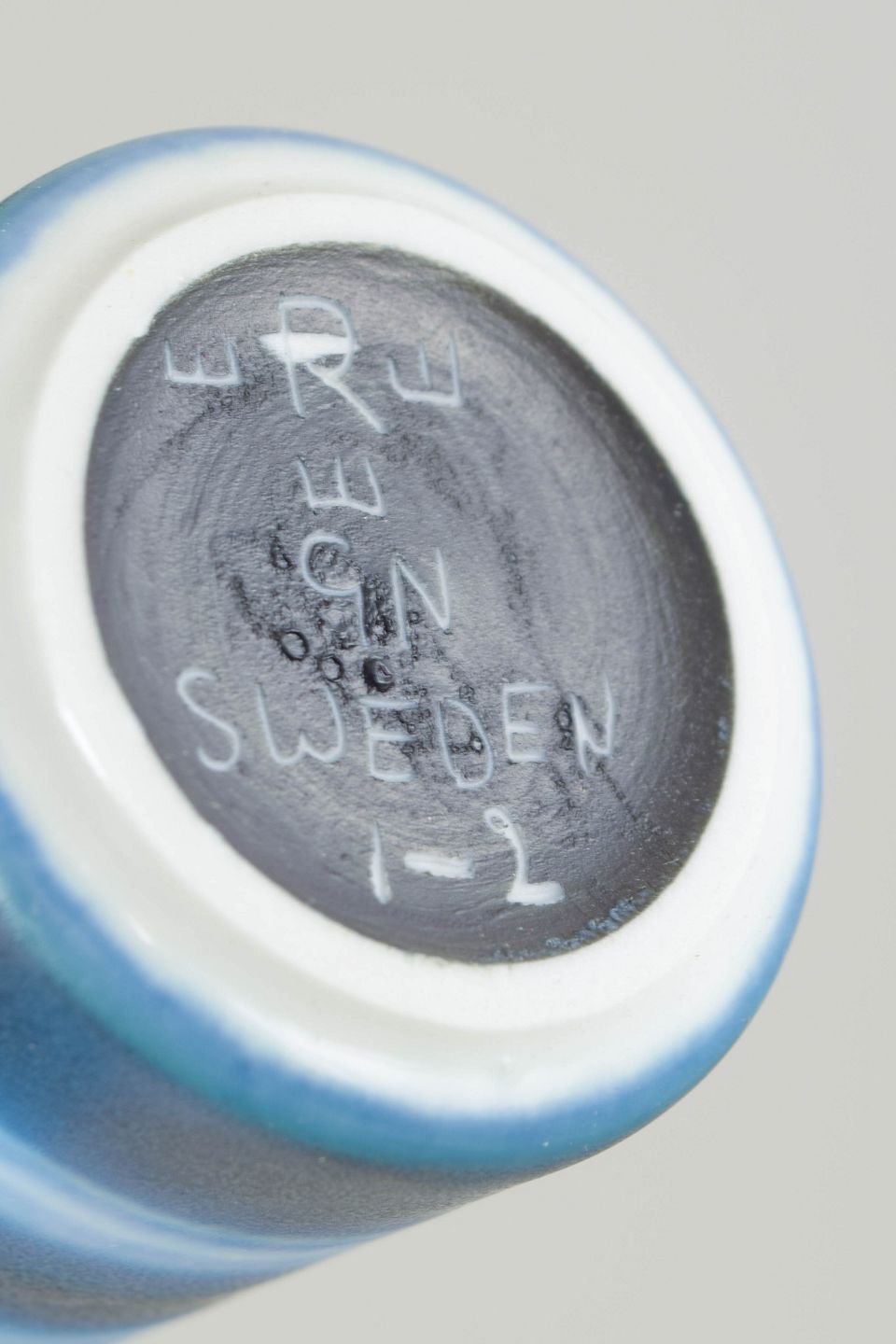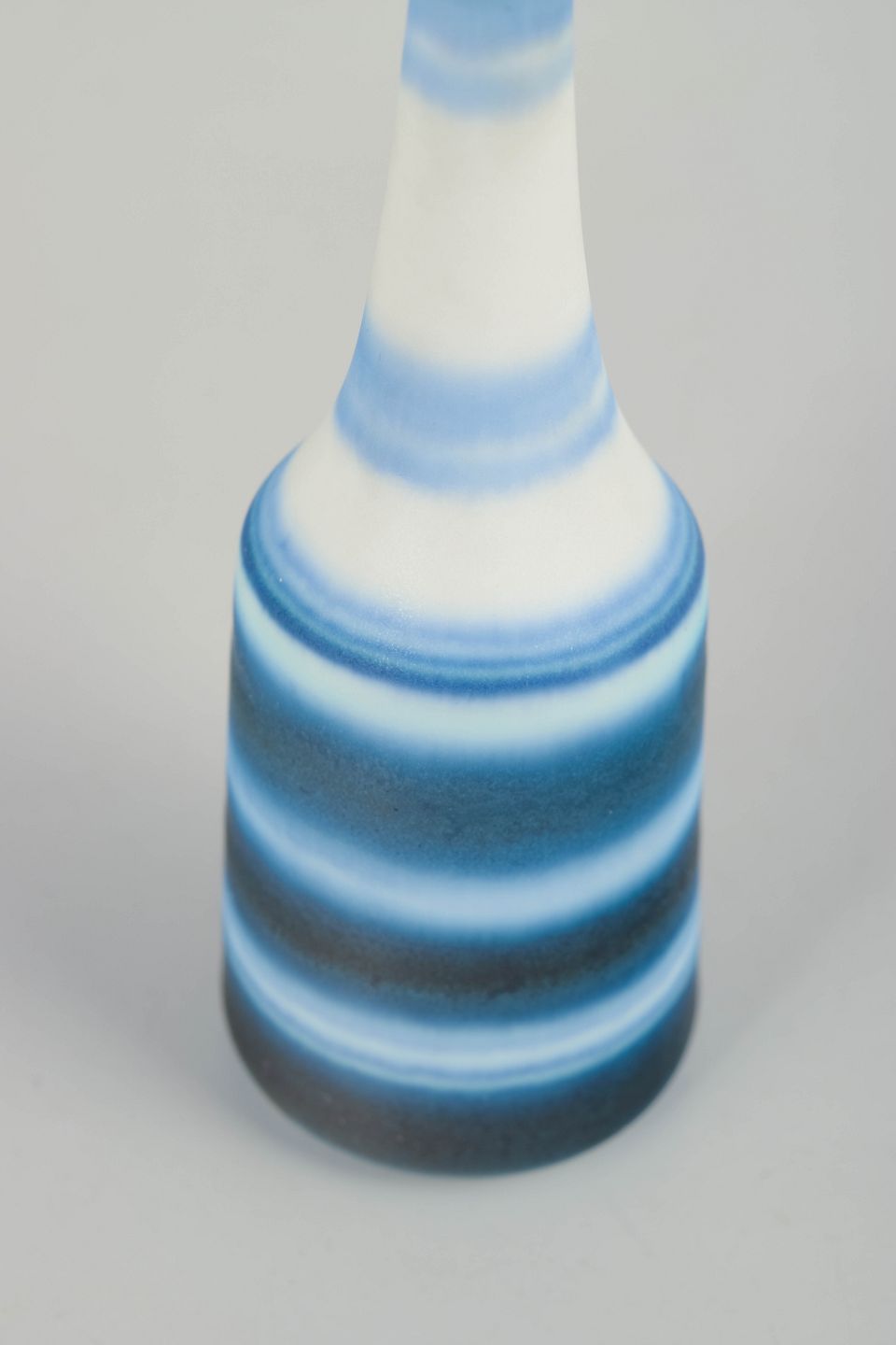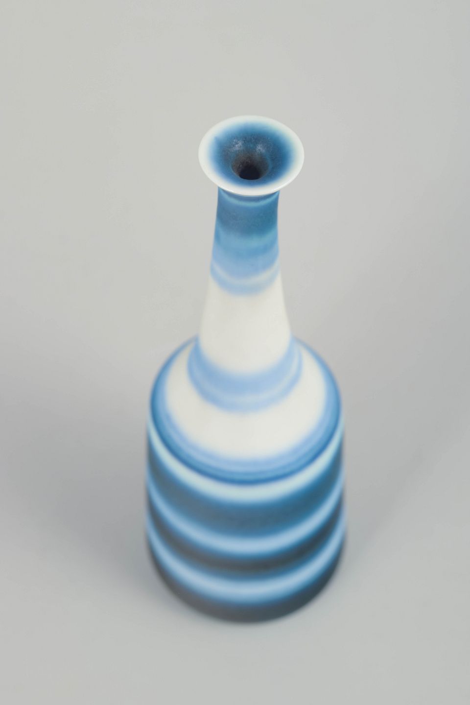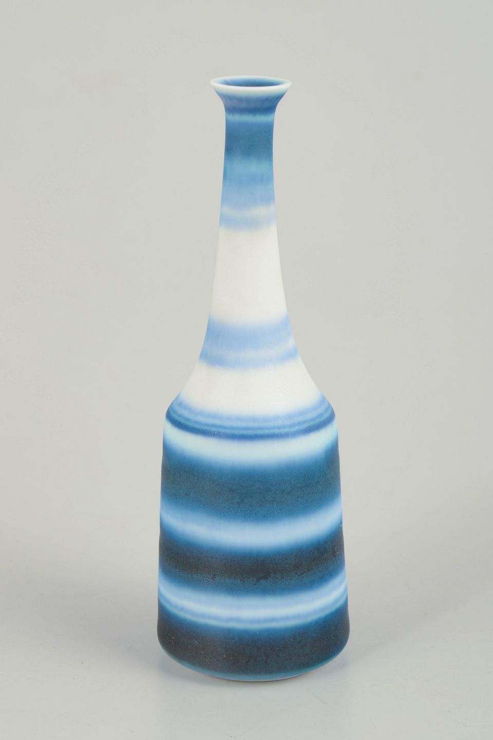 Gunnar Nylund for Rörstrand, miniaturevase.Slank miniaturevase i drejet stentøj med horisontale bånd i blå og hvide nuancer, udført i Nylunds karakteristiske glasurarbejde.