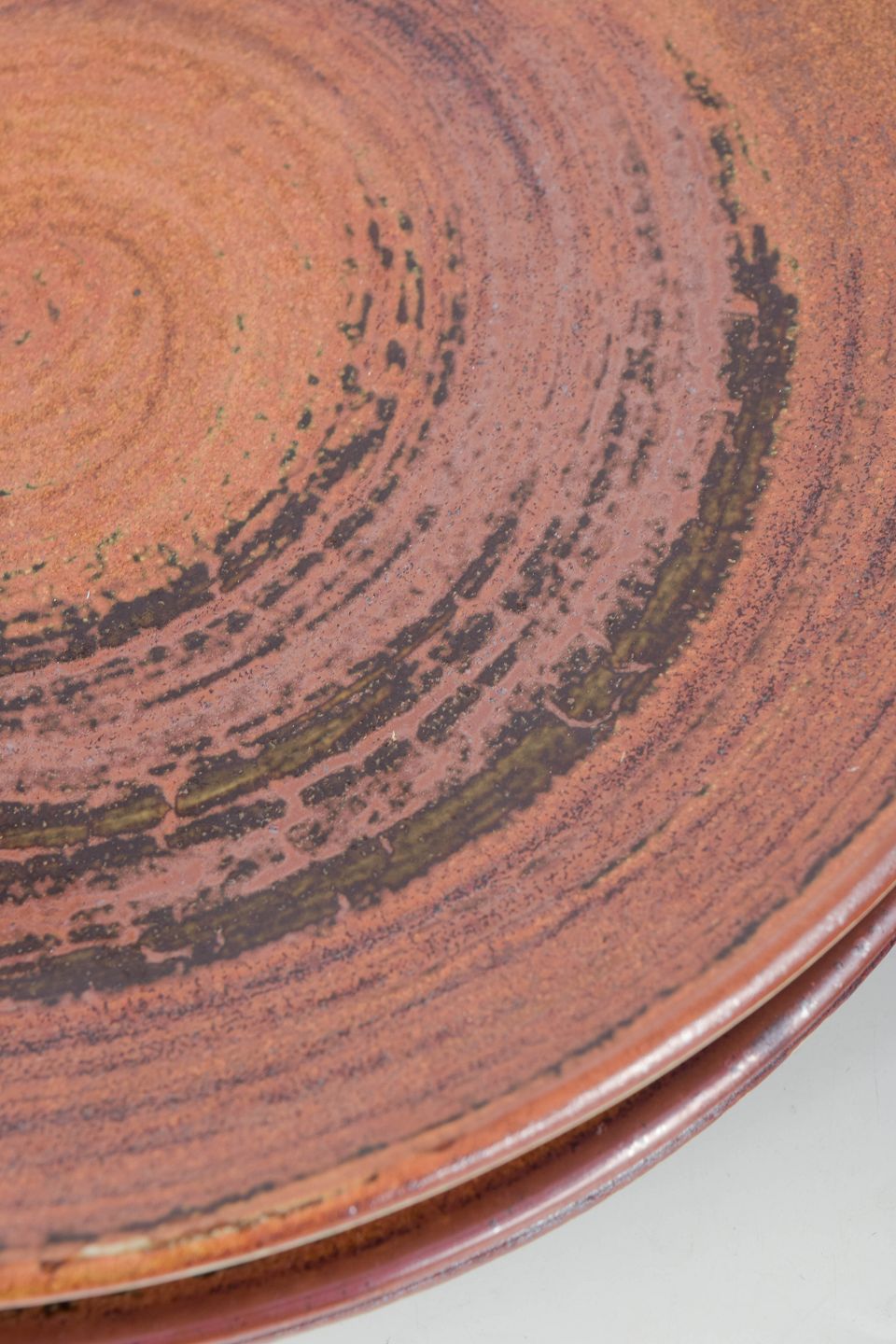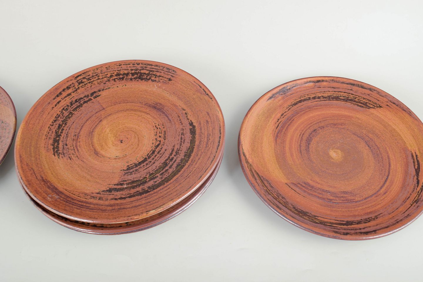Carl-Harry Stålhane for Designhuset, sæt med fem middagstallerkener.Hånddrejede middagstallerkener i stentøj med varm brunlig og kobbertonet glasur i cirkulært drejet mønster, hver tallerken med let variation i udtryk.