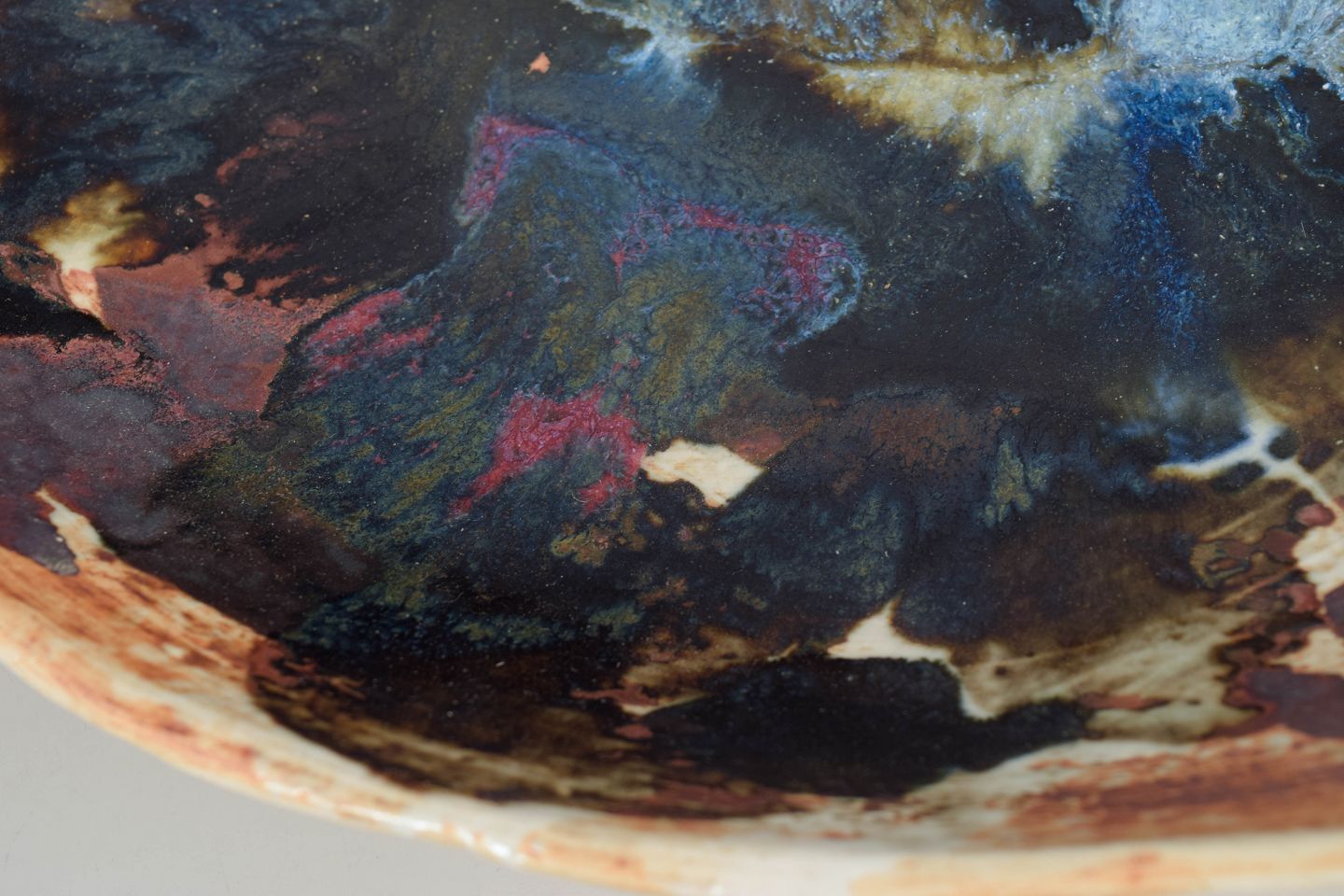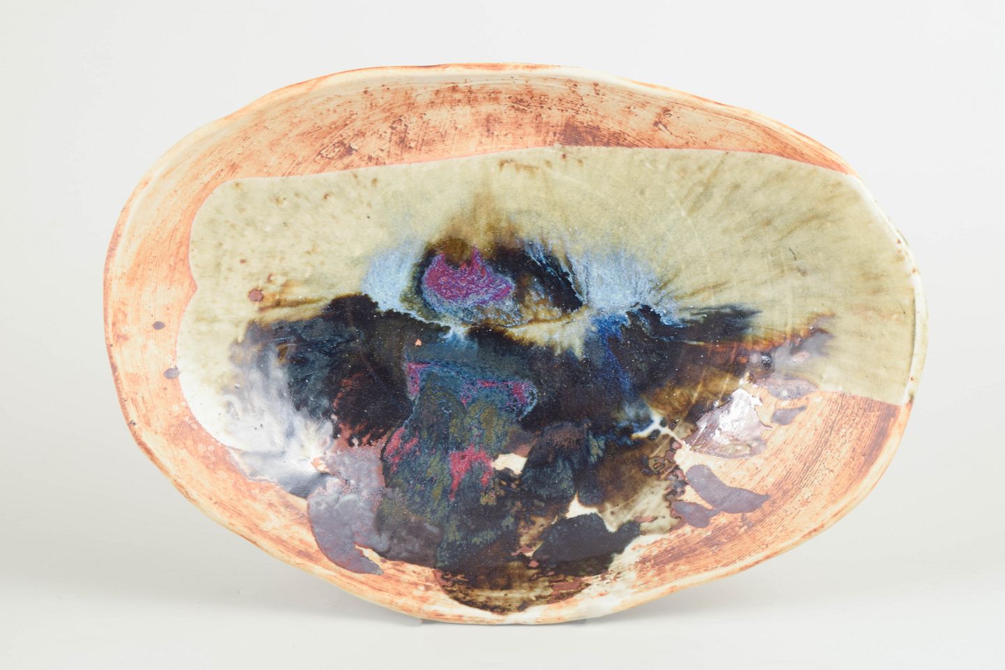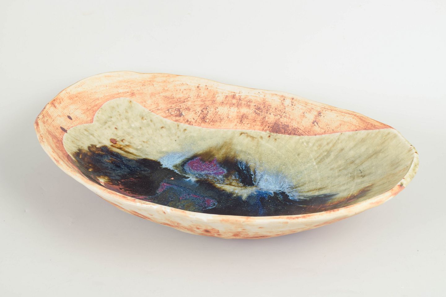 Conny Walther, stor skål.Unik, organisk formet skål i drejet stentøj med levende, abstrakt dekoration og flerfarvet glasur i jordfarver og blålige nuancer.