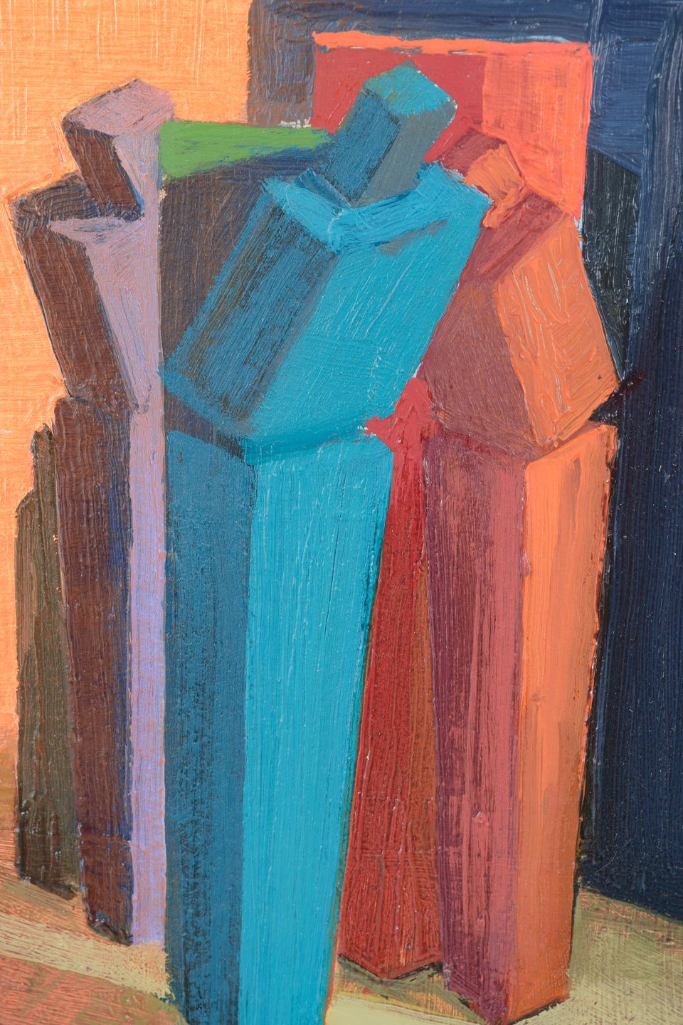 Göran Rydén, oliemaleri på træplade, svensk billedkunstner.Kubistisk komposition med stiliserede, arkitektoniske figurer i klare farvefelter, udført i olie på træplade og signeret.