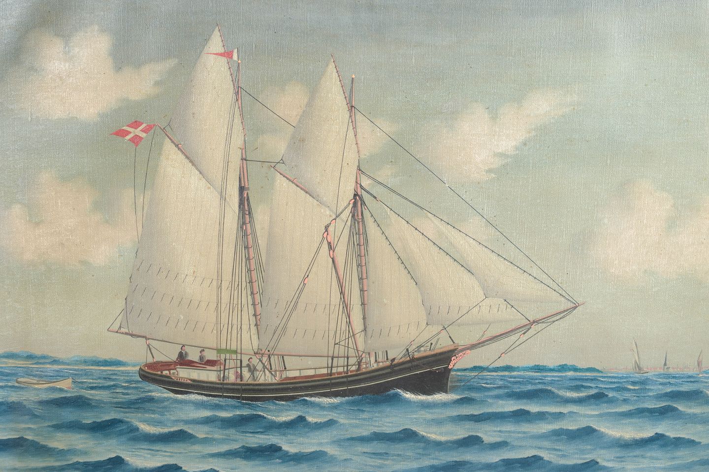 Danske skibsmalerier omkring år 1900 viderefører den maritime tradition fra 1800-tallet med fokus på nøjagtig gengivelse af skibstyper, rigning og sejlføring. Motiverne fungerede ofte som mindebilleder af konkrete skibe og var populære blandt søfolk, redere og havnebyer som Svendborg. Stilen kombinerer dokumentarisk præcision med stemningsfuld skildring af hav og himmel.