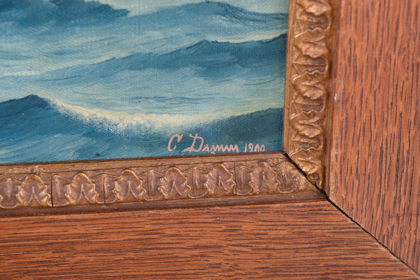 C. Damm, skibsmaleri med to-mastet skonnert “Peder” af Svendborg.Maritimt motiv med sejlskib i åbent farvand, udført i naturalistisk stil med rolige bølger og lys himmel. Signeret og dateret 1900.