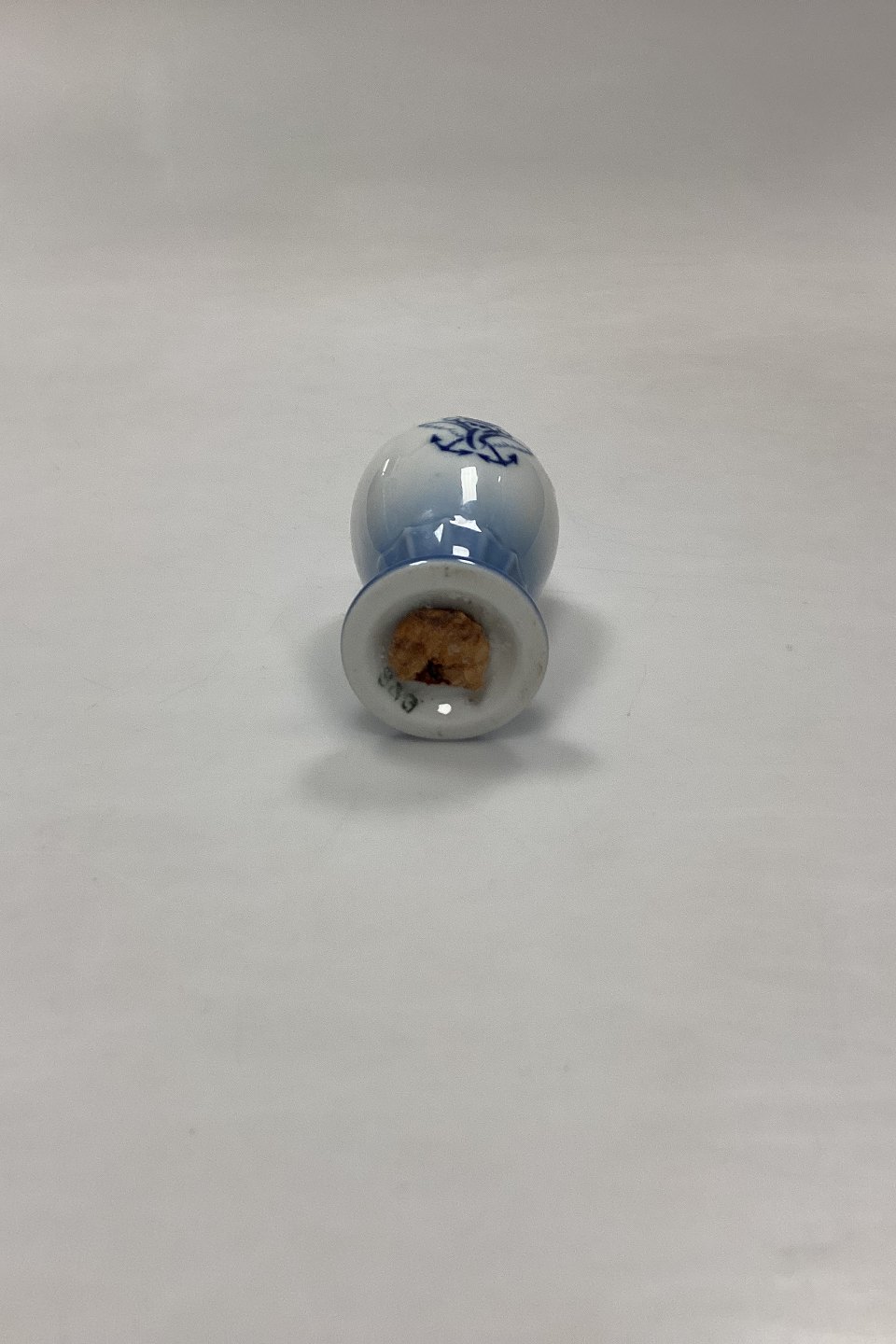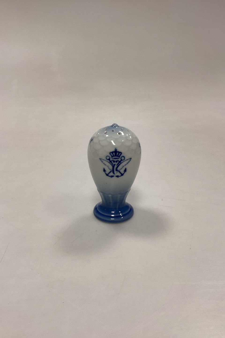Bing og Grøndahl Blå Tone Saltbøsse No. 52 A med Logo. Logo med krone, hjul med vinger og ankre er højst sandsynligt fra et shippingfirma.Måler 7,5 cm / 2,95 in.