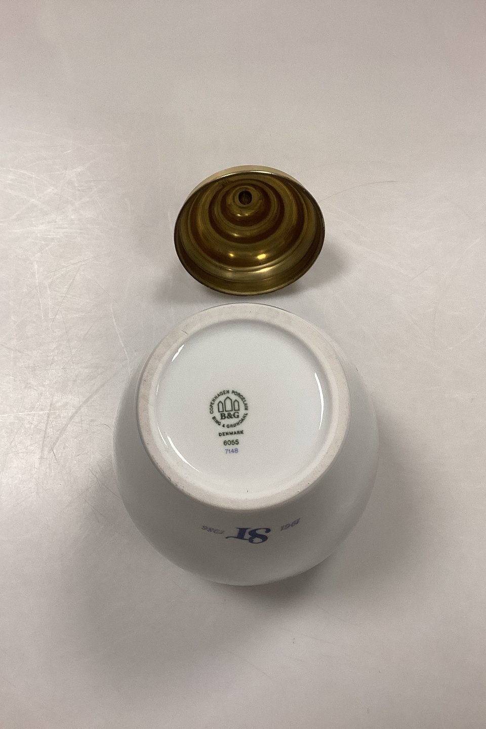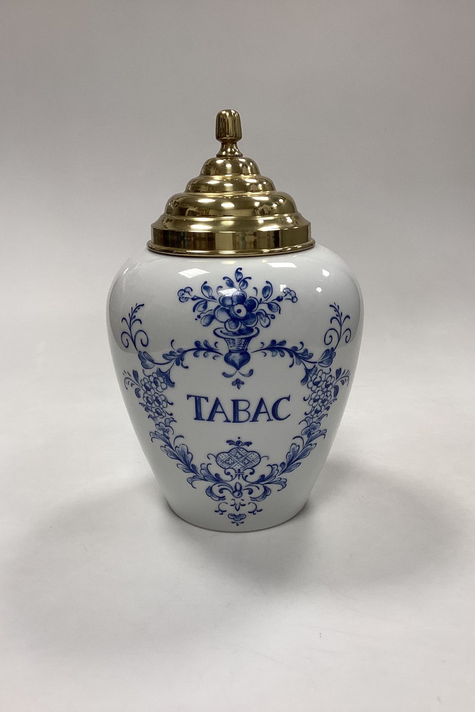 Bing og Grøndahl Tobakskrukke - Tabac No.6055/7148. Fremstillet i anledning af Skandinavisk Tobakskompagnis 25-års Jubilæum (1961-1986). Porcelæn med messinglåg. Logo på bagsiden: 1961 ST 1986.Måler 25 cm / 9,84 in. med låg.