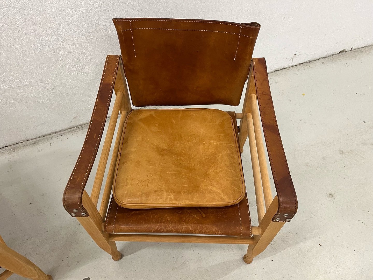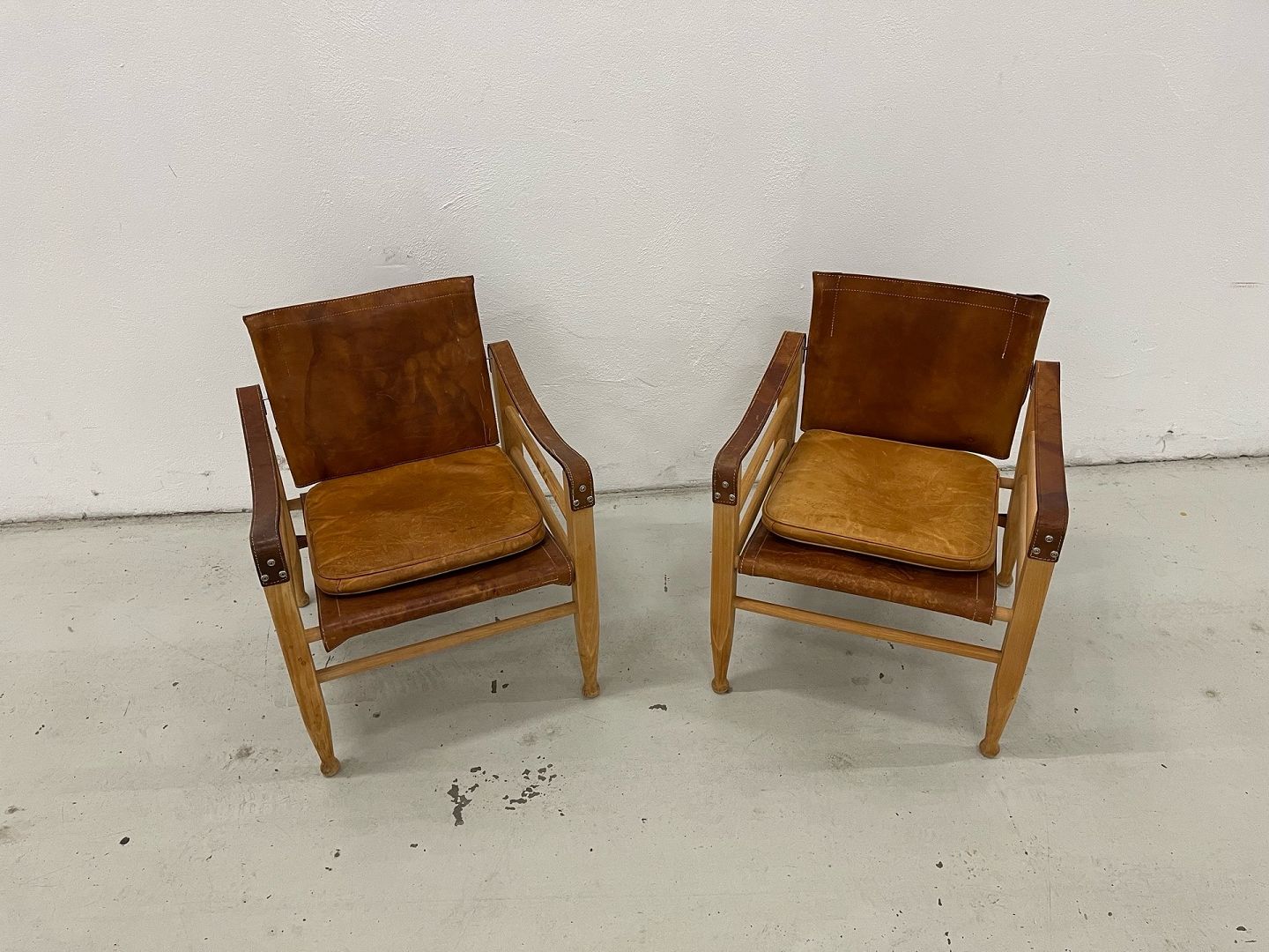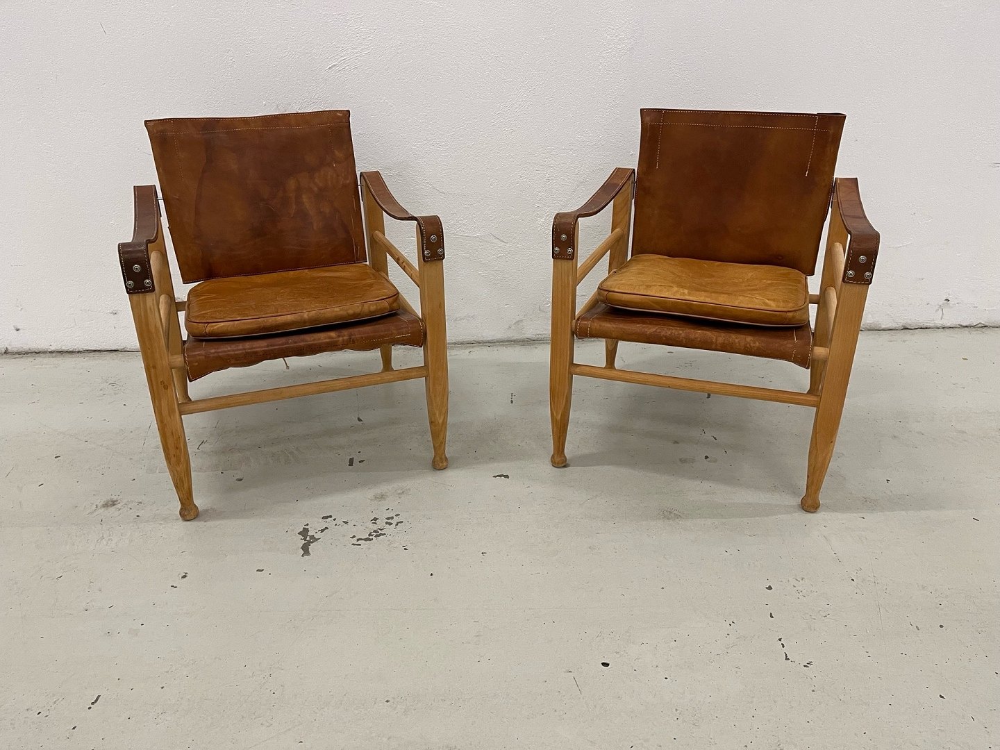 Aage Bruun & Søn – Safari-Stühle, 1960er Jahre. Ein absolut einzigartiges und außergewöhnlich gut erhaltenes Set Safari-Stühle von Aage Bruun & Søn aus den 1960er Jahren. Die Stühle bestehen aus einem Gestell aus massivem Buchenholz und sind mit cognacfarbenem, patiniertem Leder bezogen (Sitzfläche, Rückenlehne und Armlehnen). Das Leder weist eine wunderschöne Patina auf, und sowohl Schnallen als auch Riemen und Gestelle sind in makellosem Originalzustand. Die Stühle stammen aus einem Nichtraucherhaushalt ohne Haustiere und waren seit ihrer Anschaffung in Erstbesitz. Das Set besteht aus einem originalen Ledersofa und Kissen. Maße: Höhe: 67 cm – Breite: 55 cm – Tiefe: 57 cm – Sitzhöhe: 36 cm. Händler