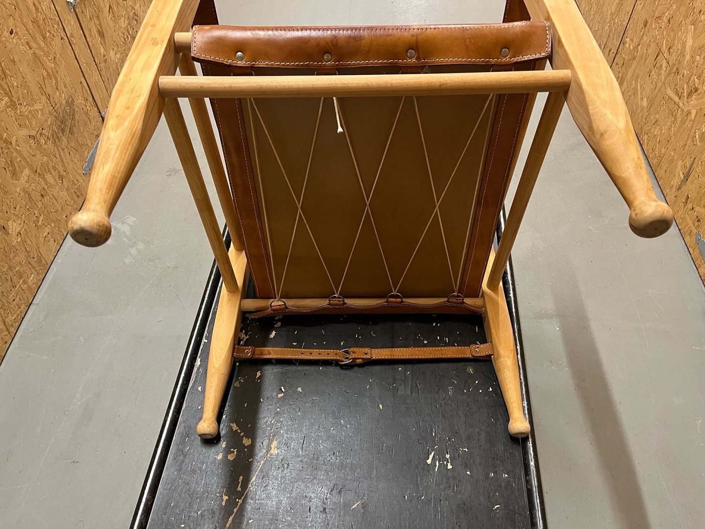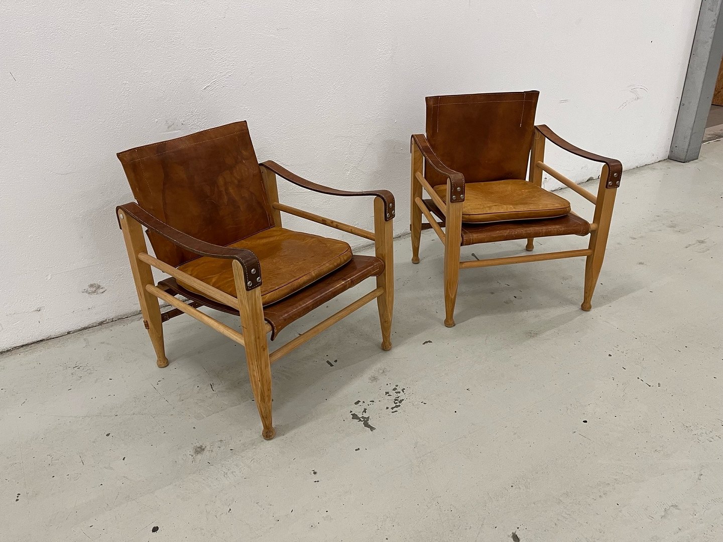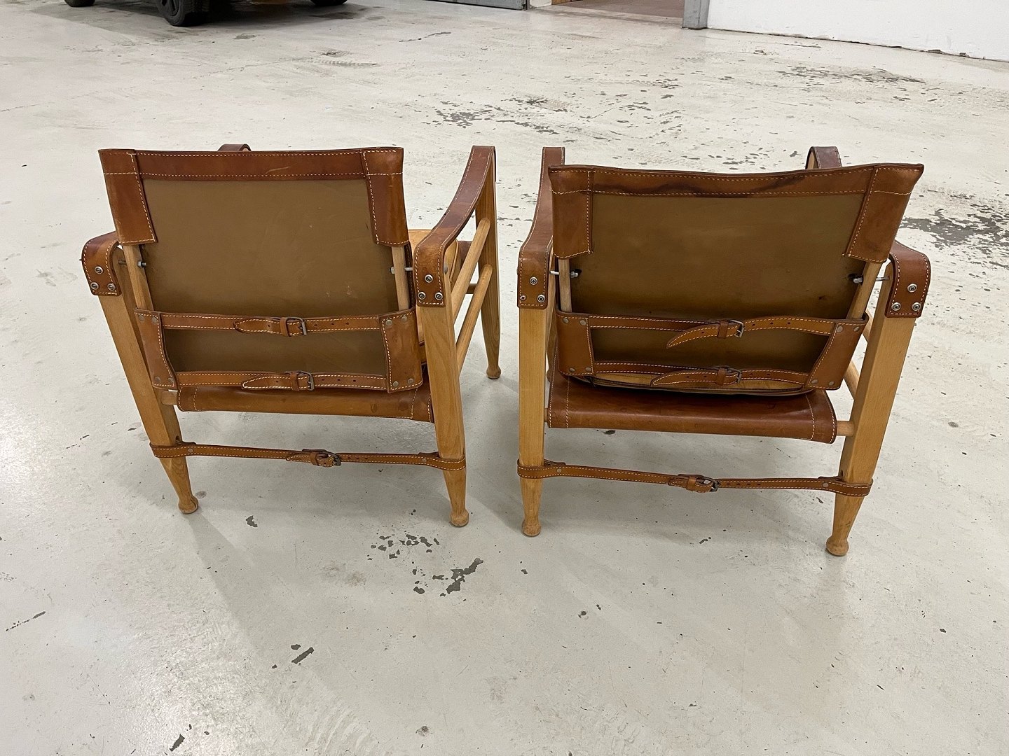 Aage Bruun & Søn – Safari-Stühle, 1960er Jahre. Ein absolut einzigartiges und außergewöhnlich gut erhaltenes Set Safari-Stühle von Aage Bruun & Søn aus den 1960er Jahren. Die Stühle bestehen aus einem Gestell aus massivem Buchenholz und sind mit cognacfarbenem, patiniertem Leder bezogen (Sitzfläche, Rückenlehne und Armlehnen). Das Leder weist eine wunderschöne Patina auf, und sowohl Schnallen als auch Riemen und Gestelle sind in makellosem Originalzustand. Die Stühle stammen aus einem Nichtraucherhaushalt ohne Haustiere und waren seit ihrer Anschaffung in Erstbesitz. Das Set besteht aus einem originalen Ledersofa und Kissen. Maße: Höhe: 67 cm – Breite: 55 cm – Tiefe: 57 cm – Sitzhöhe: 36 cm. Händler