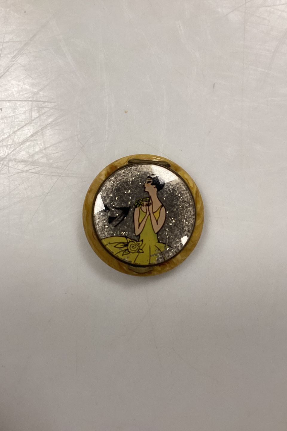 Art Deco Pilleæske med Spejl. Formentlig bakelit i gul marmorering. Motiv med kvinde i gul kjole på baggrund af sølvglitter. Måler 4,5 cm / 1,77 in.