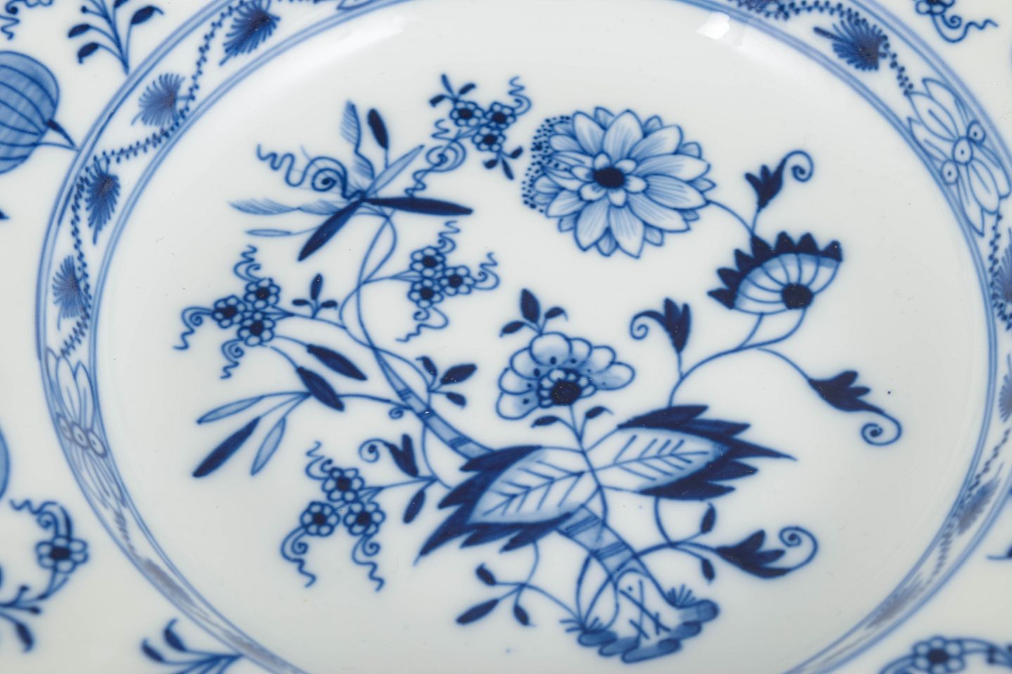 Meissens løgmønster blev introduceret i 1739 og er inspireret af østasiatiske porcelænsdekorationer med stiliserede blomster og frugtmotiver udført i underglasurblåt. Mønstret blev et af fabrikkens mest varige og genkendelige stel. Omkring år 1900 fortsatte Meissen produktionen af løgmønster i høj kvalitet, hvor de dybe tallerkener blev anvendt til supper og serveringsretter og vidner om fabrikkens tekniske kunnen og dekorative tradition.