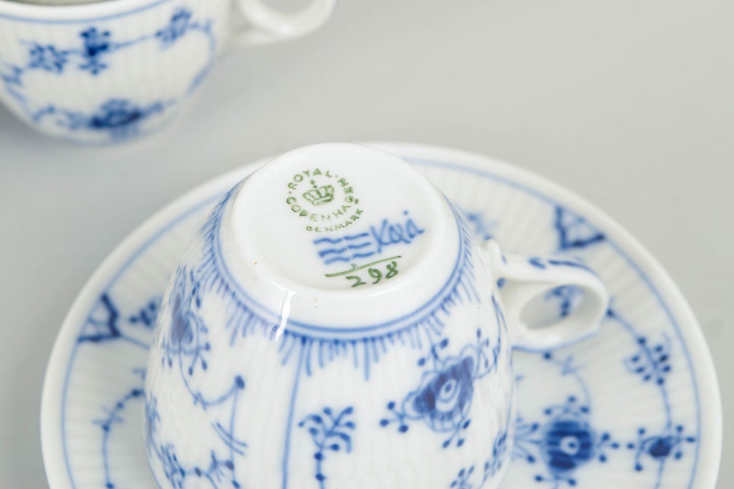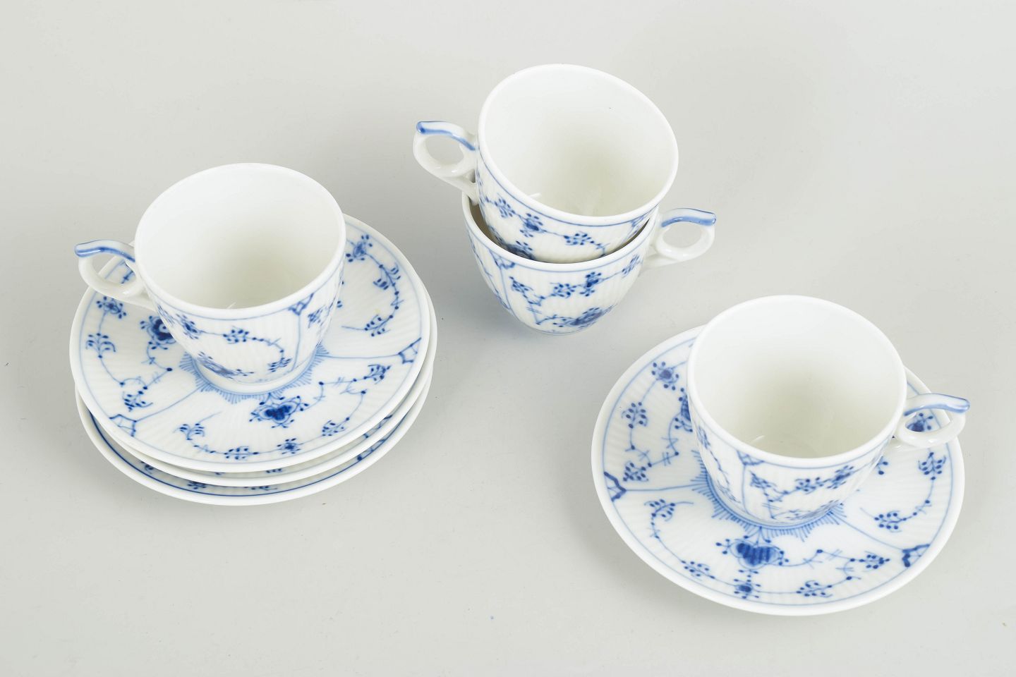 Royal Copenhagen, Musselmalet riflet kaffekopper med tilhørende underkopper, sæt af 4.Beschreibung: