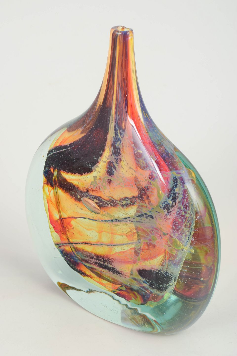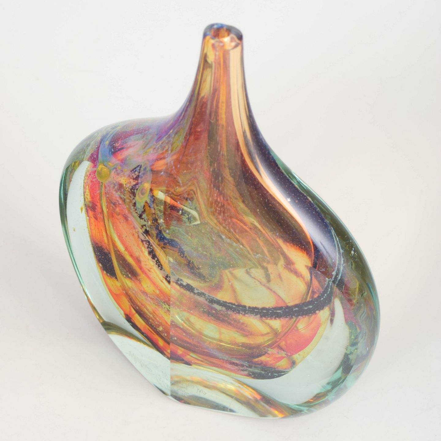 Mdina Glass, kunstglasvase.Organisk formet kunstglasvase i kraftigt, mundblæst glas med indkapslede, hvirvlende farver i rav, orange og mørke kontraster, afsluttet med klart ydre lag. Frit opbygget, asymmetrisk form med markant tyngde i bunden. Signeret under bunden Mdina glass, Malta”.
