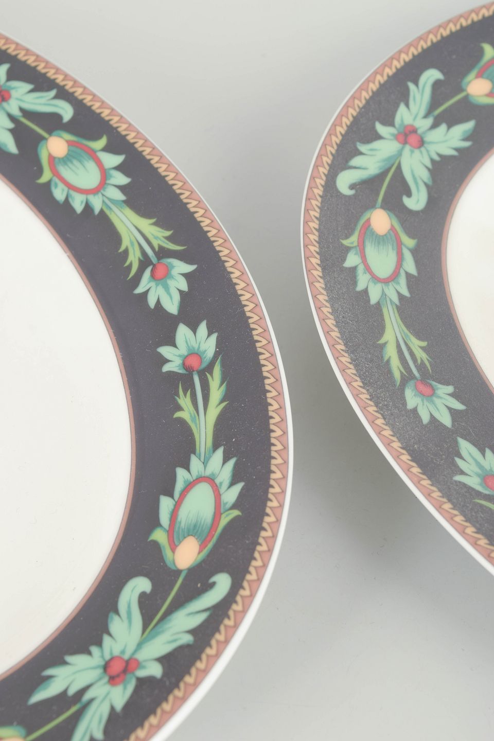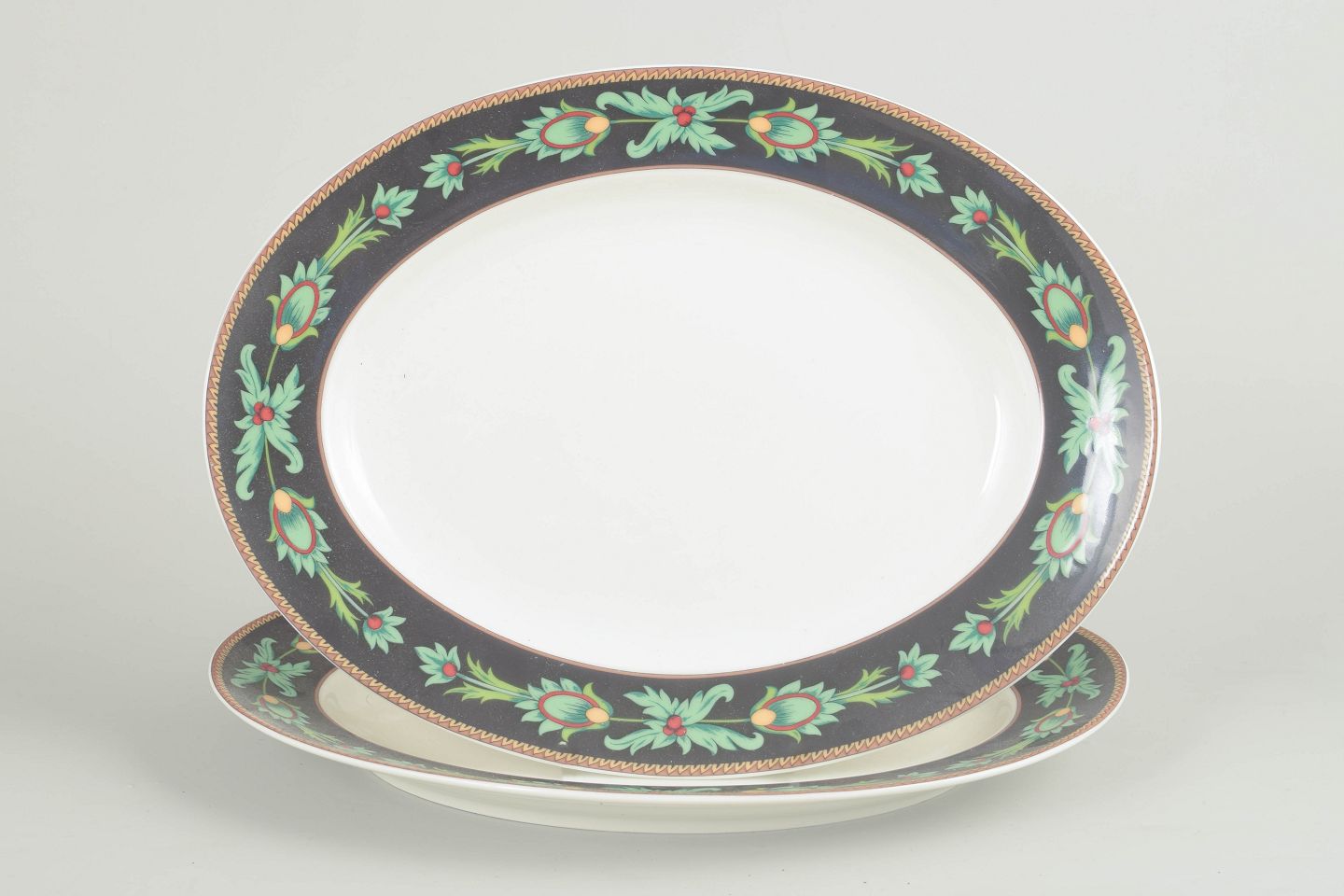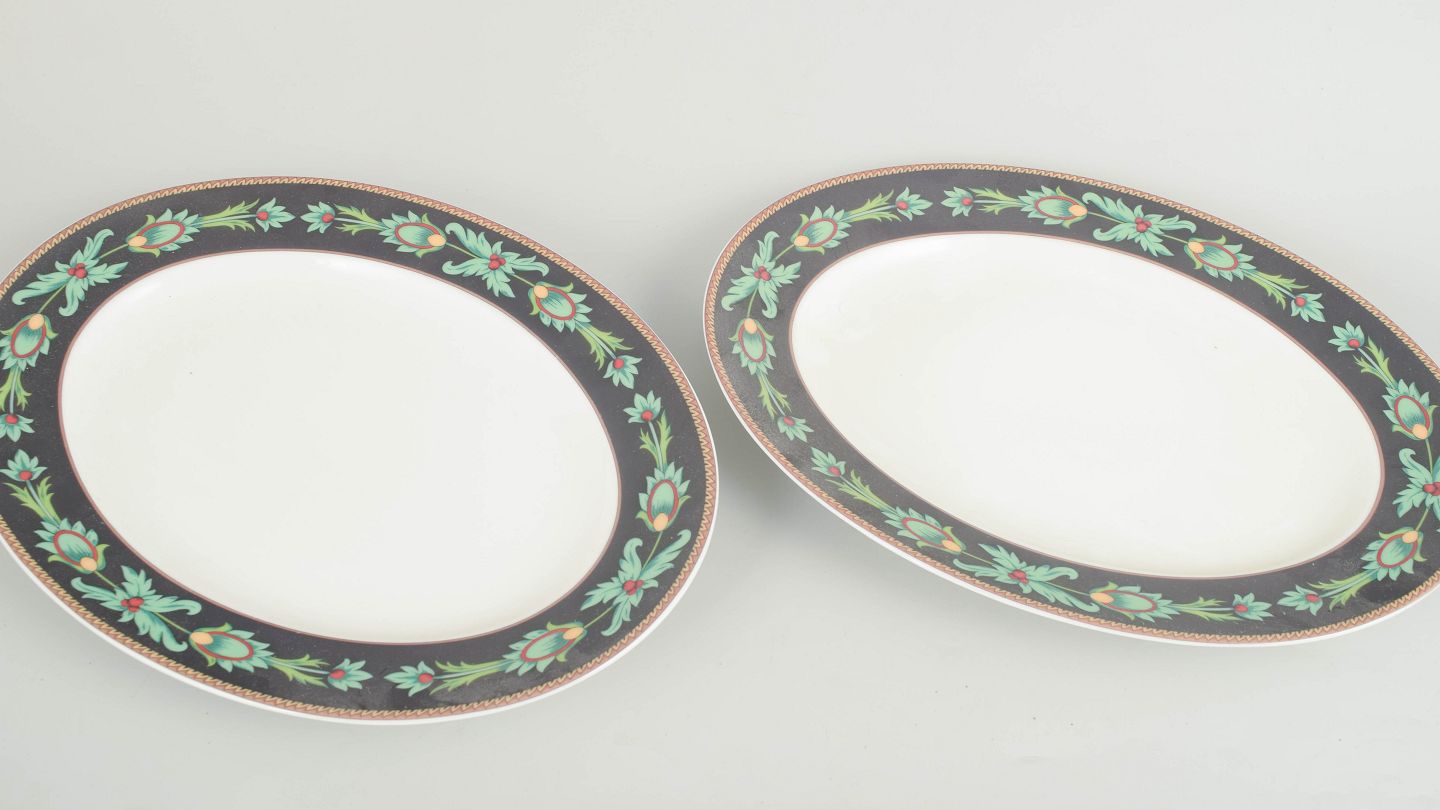Nina Campbell for Rosenthal, to ovale fade.Sæt med to ovale fade i porcelæn fra Rosenthal Classic, dekoreret i serien Mayfair med mørk bort, stiliserede grønne bladranker og gulddetaljer, produceret i 1980’erne.
