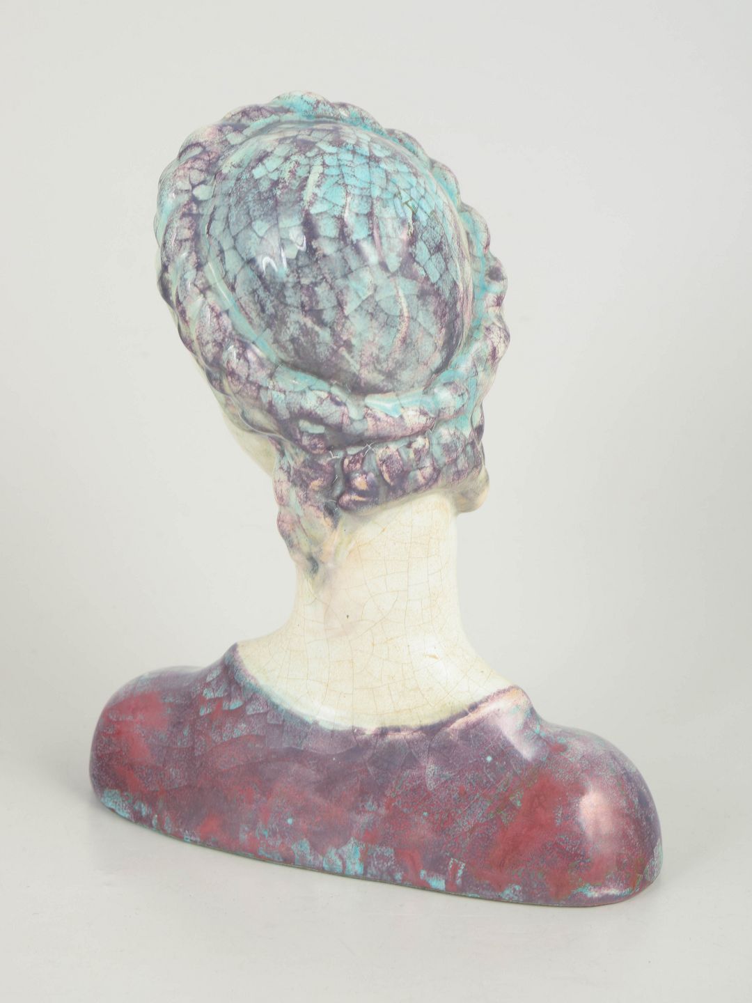 Michael Andersen, keramisk buste.Elegant kvindebuste i stentøj udført i Art Deco-inspireret stil med stiliseret hår og let nedadbøjet hoved. Glaseret i dæmpede, krakelerede nuancer af creme, violet og turkis. Fremstillet på Bornholm og stemplet under bunden med værkets ovale M.A.&S.-mærke.