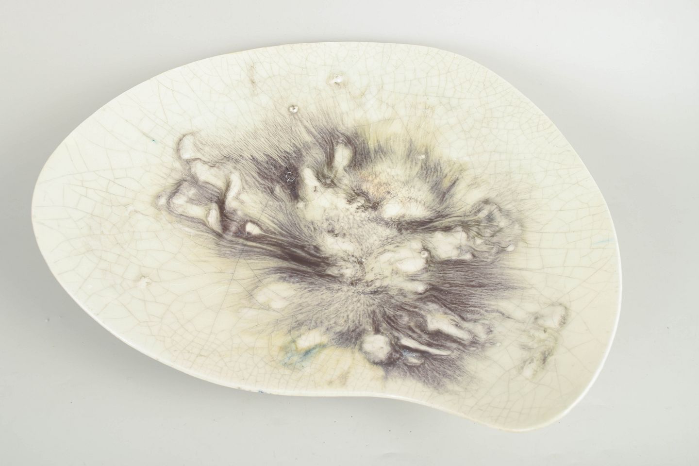Hans Hedberg for Biot, stort fad.Organisk formet fad i stentøj med lys krakeleret glasur og central, malerisk dekoration i grå og violette nuancer. Modellen er kendetegnet ved en asymmetrisk, let bølgende form og fremstår signeret under bunden.