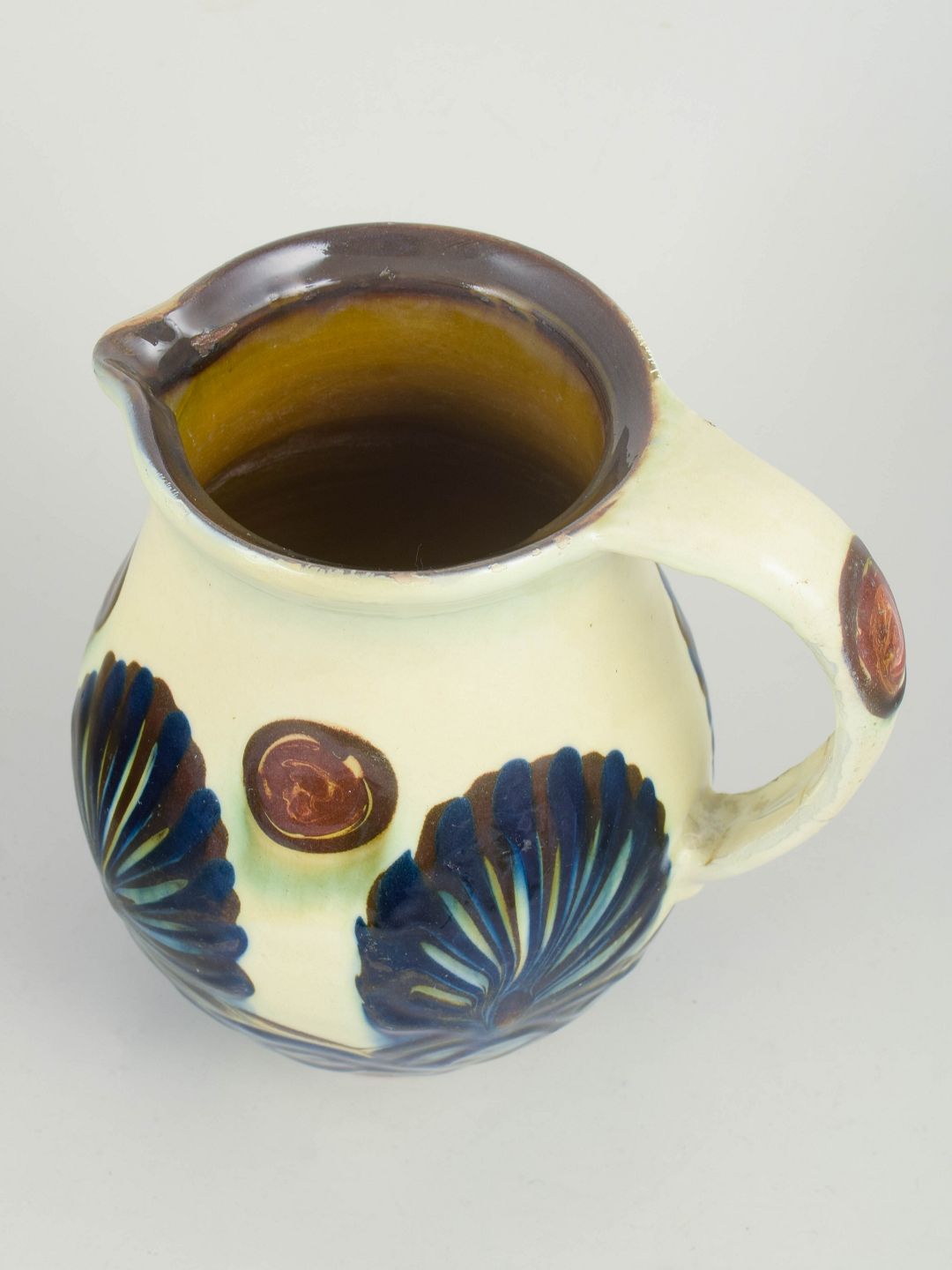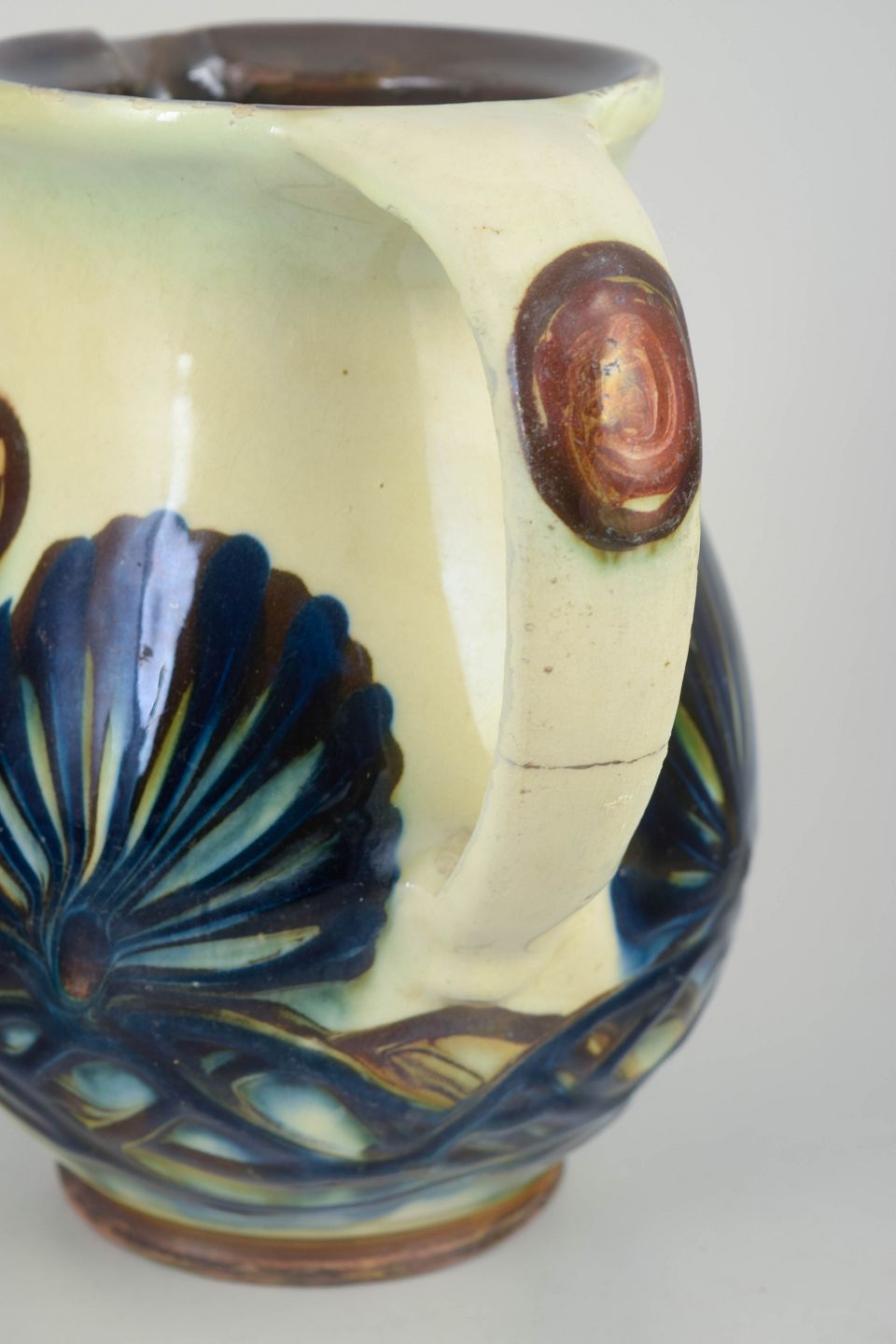 Kähler, kande med reliefdekoration.Kande i glaseret stentøj med markant reliefdekoration i form af stiliserede blad- og båndmotiver i blå og grønne nuancer på lys bundglasur. Formen er kraftfuld og balanceret med tydelig hank og hældetud, og dekorationen er integreret i godset som et plastisk element, der giver et levende samspil mellem form og overflade.