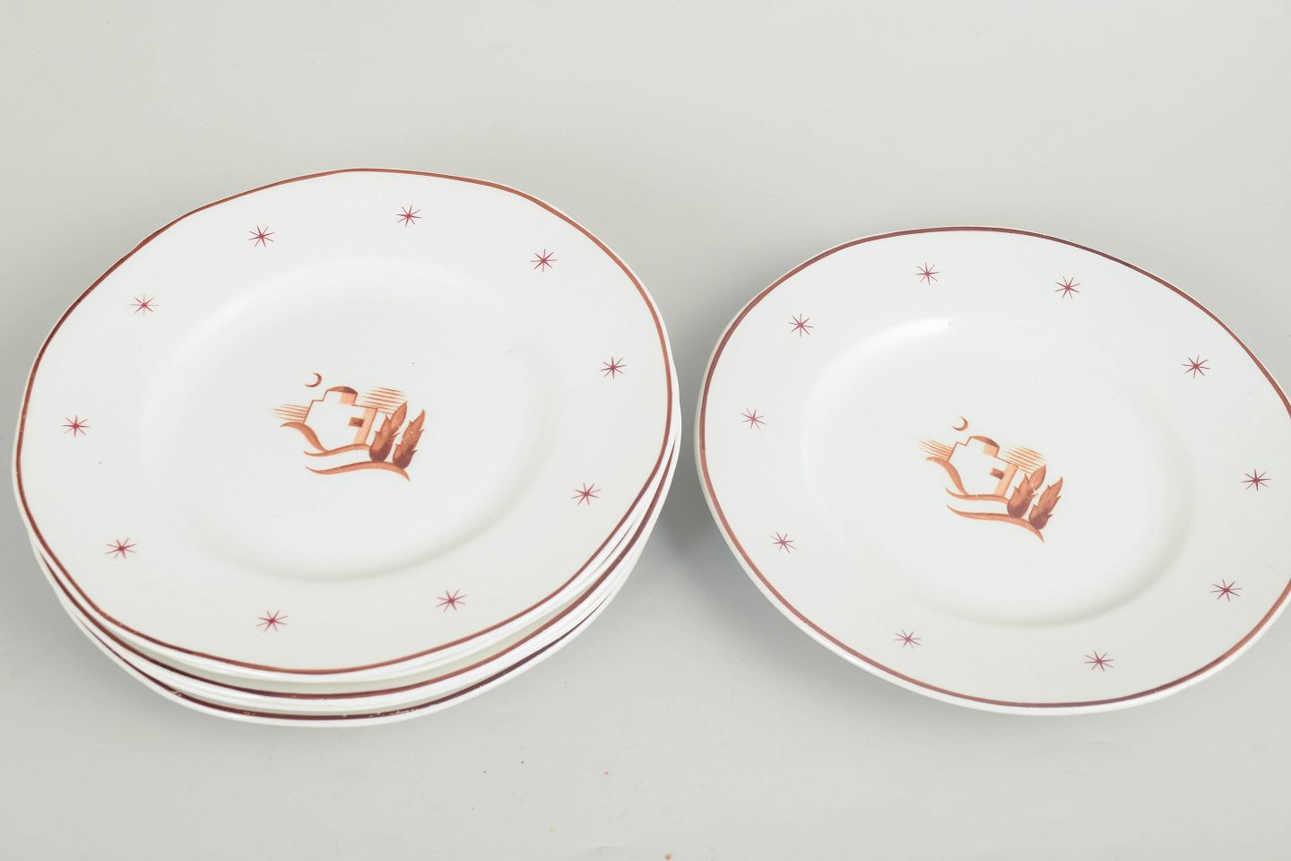Arabia, Orient, sæt med 6 små frokosttallerkener.Små tallerkener i glaseret fajance med bølget fane, brun kantstreg og stjernemotiver samt centralt orientalsk landskabsmotiv. Model Orient.