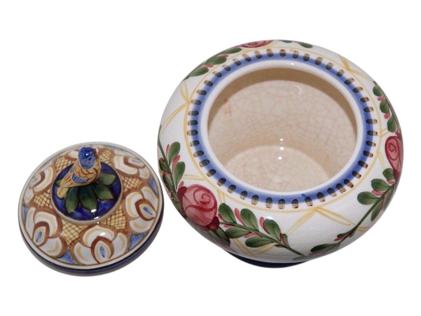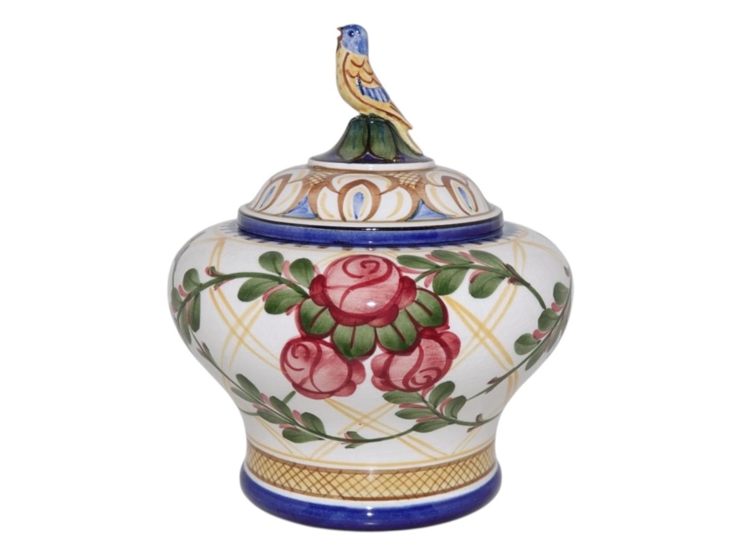 Aluminia lågkrukke med fugl.Bemærk denne vare er på vores fjernlager. Den kan købes online, eller hvis du vil se den i butikken så skriv eller ring. Vi kan ofte have den i forretningen samme dag.
