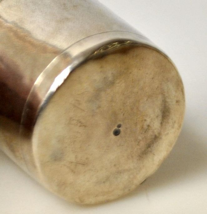 Dänischer Barock-Silberbecher, 1716. Mit Gravuren: HNS 1716 und später: CRS. Keine sichtbaren Herstellermarken. Höhe: 5,3 cm. Gewicht: 52 Gramm.Bestellnummer: 28978