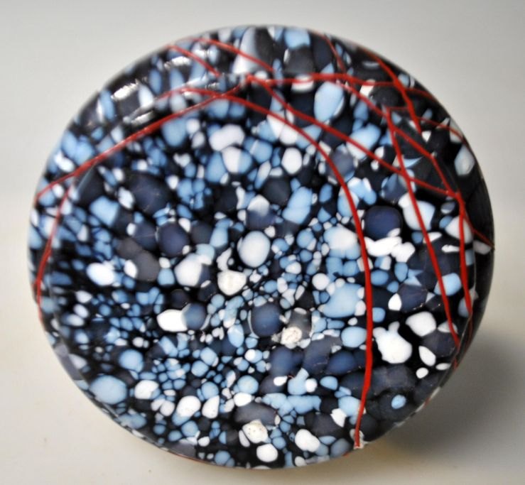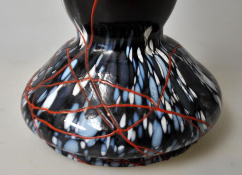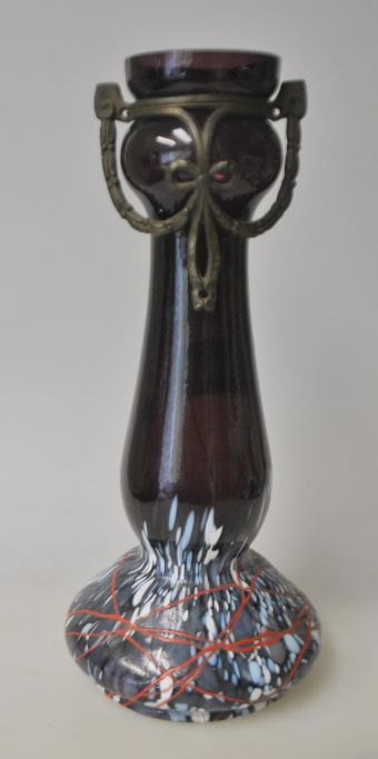 Jugendvase, ca. 1900, Deutschland. Violettes Glas mit Sockel aus weißem, blauem und grauem Glas. Oberhalb roten Glaslinie. Oben mit Bronzedekor montiert. H.: 25,2 cm.Spannendes Stück!