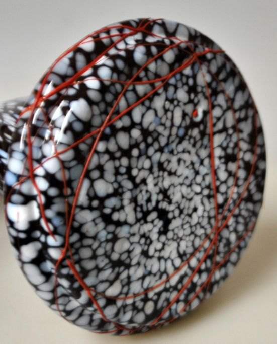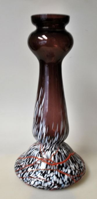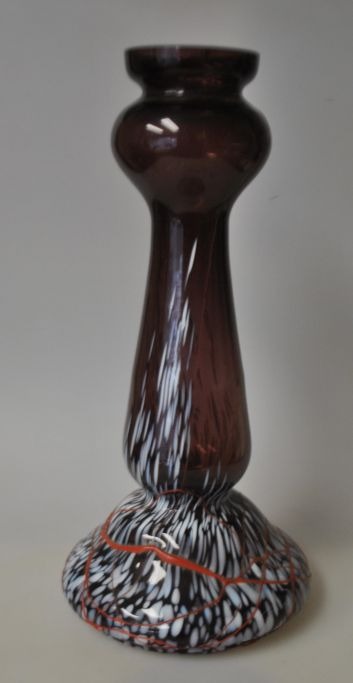 Jugendstilvase, um 1900, Deutschland. Violettes Glas mit einem Sockel aus weißem, blauem und grauem Glas. Roter Glasrand darüber. Höhe: 29,5 cm.Spannender Beitrag!