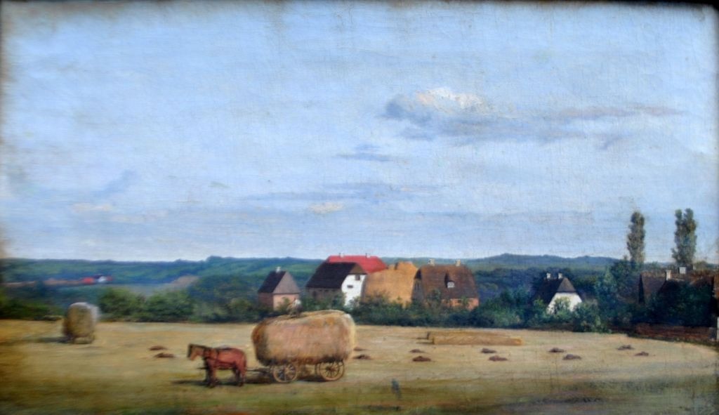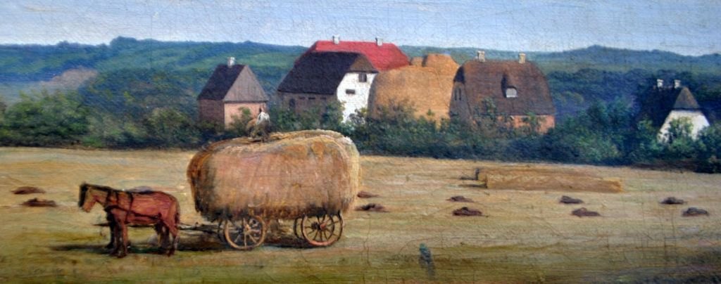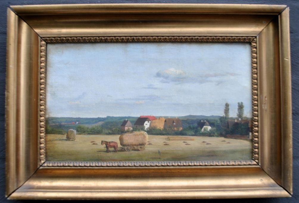 Rademacher, Niels Grønbek (1812–1885), Dänemark: Ernteszene auf einem neuseeländischen Gutshof. Öl auf Leinwand. Schwach signiert. 19 × 32,5 cm.Gerahmt: 29 x 42 cm.