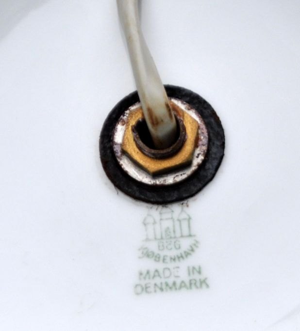 Bing & Grondahl Heiberg Tischleuchte aus Porzellan, 20. Jahrhundert. Kopenhagen, Dänemark. Mit Messingbeschlägen. Höhe mit Fassung: 52,5 cm. Geschenk von Volkswagen, Dänemark. Entsprechender Stempel vorhanden. Lampenschirm: Höhe: 31 cm, Durchmesser: 35 cm.Bestellnummer: 28972