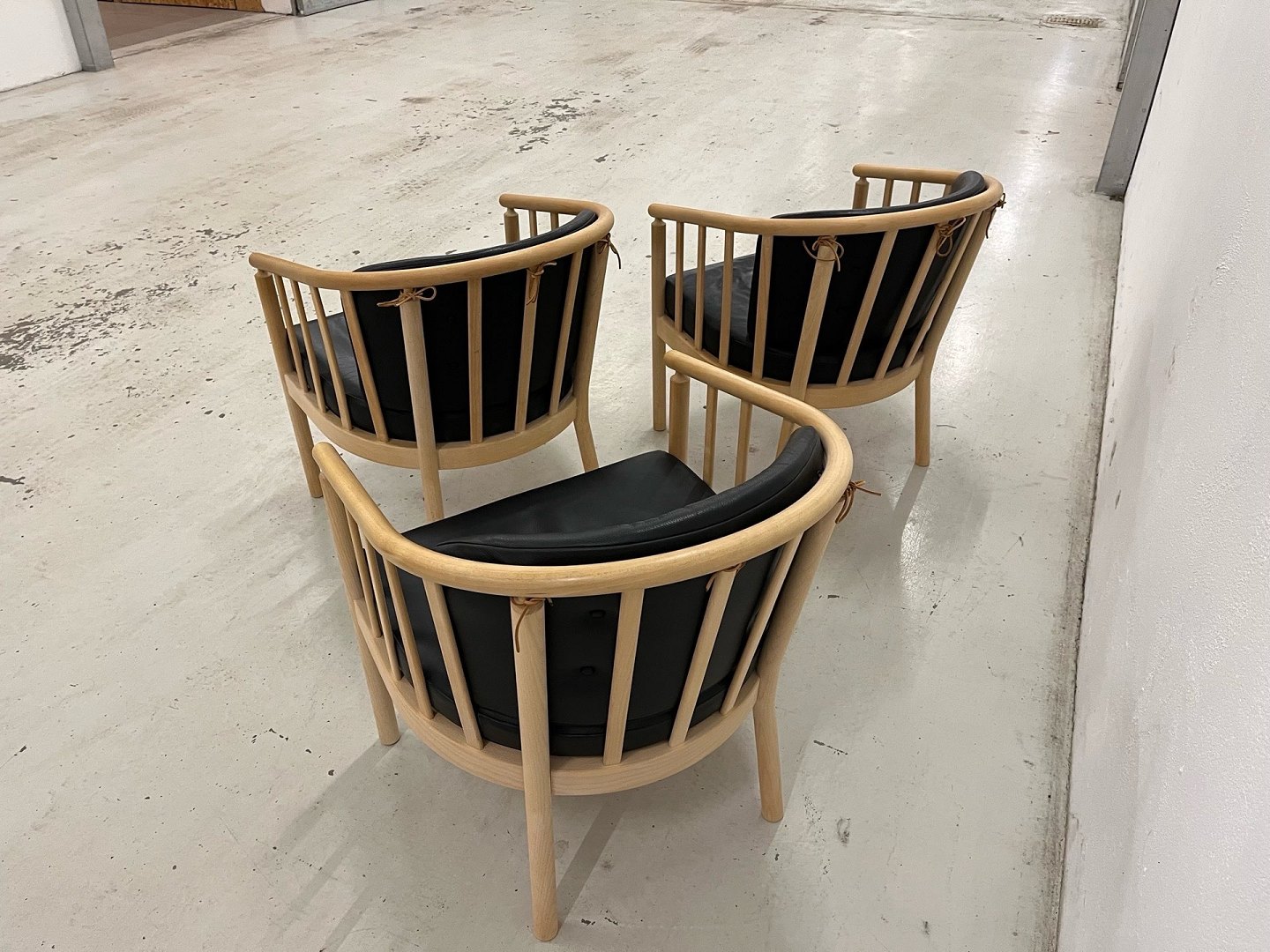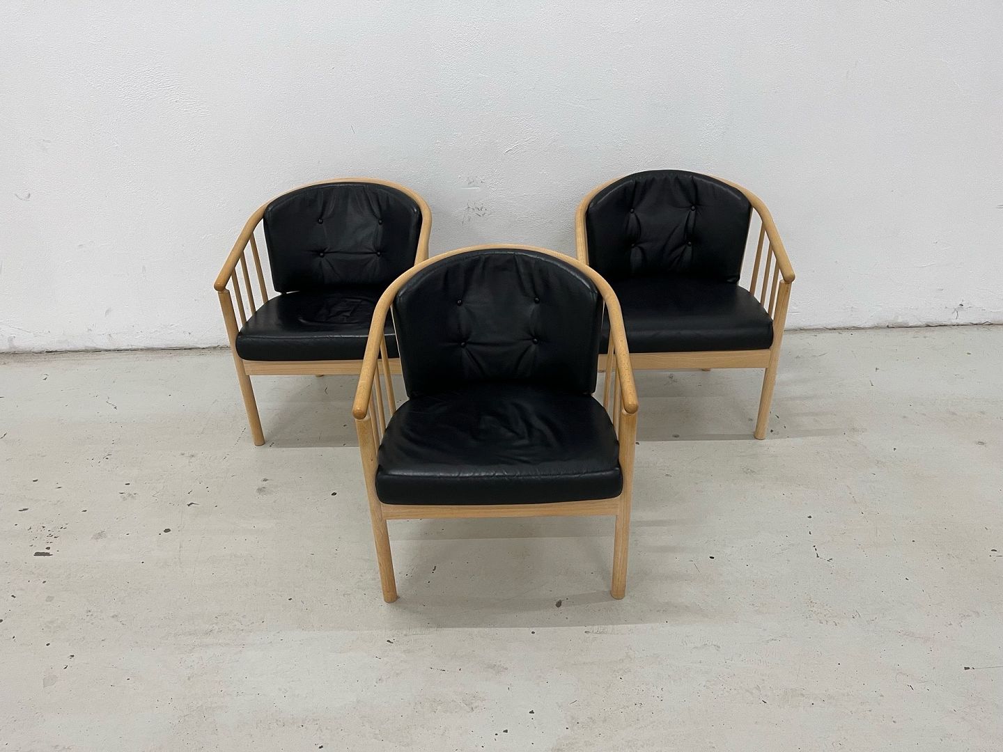 Stouby Bella Lounge-Sessel in schwarzem Semianilinleder und unbehandelter Eiche. Insgesamt werden 3 Stück angeboten. Die Sessel haben einen Neupreis von 16.285 DKK pro Stück und werden jetzt für 6.500 DKK pro Stück verkauft. Die Möbel wurden sehr pfleglich behandelt und befinden sich in einem sehr guten, nahezu neuwertigen Zustand. Sie stammen aus einem Nichtraucherhaushalt ohne Haustiere. Spezifikationen: Höhe: 74 cm, Breite: 63 cm, Tiefe: 64 cm, Farbe: Schwarz, Material: Unbehandelte Eiche, Marke: Stouby, Modell: Bella Lounge-Sessel in Eiche / schwarzem Semianilinleder Händler