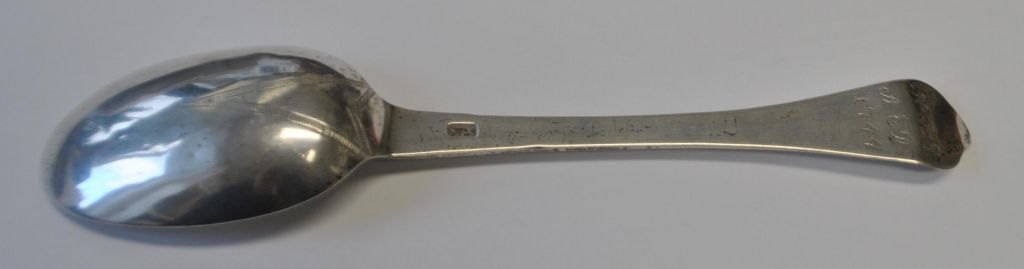 Dänischer Silberschmied (18. Jahrhundert): Silberlöffel „Rattenschwanz“. Mit Gravuren: NPS – AED 1744. Meistermarke undeutlich. Länge: 19,5 cm. Gewicht: 34 Gramm.Bestellnummer: 28890