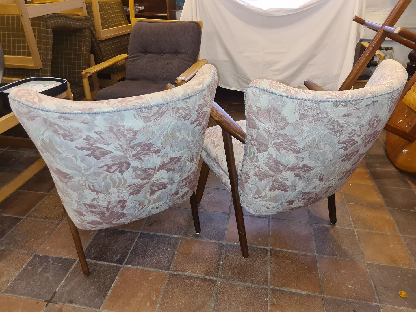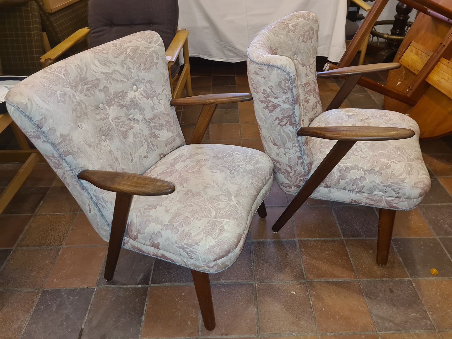 Erhardsen & Andersen par lænestole med stel i teak, betrukket med møbelstof.Fremstillet ca. 1960'erne.