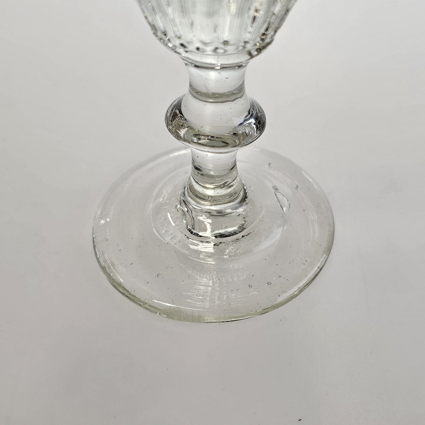 Håndblæst vinglas med riflet, tøndeformet kumme på stilk med knapProducent Conradsminde ca. 1840