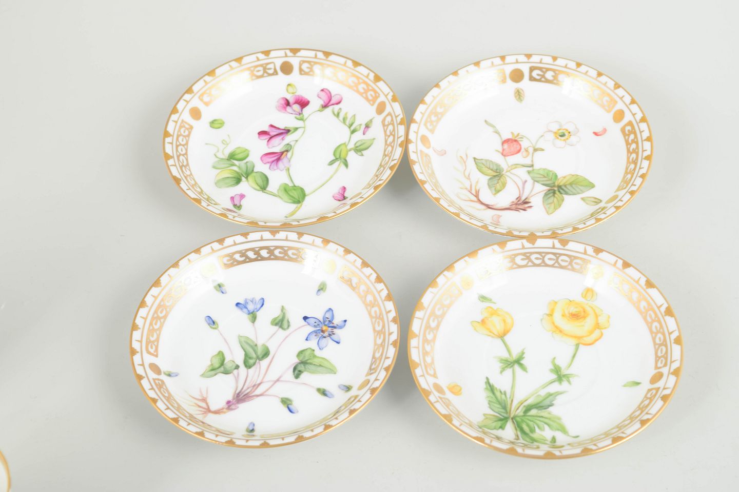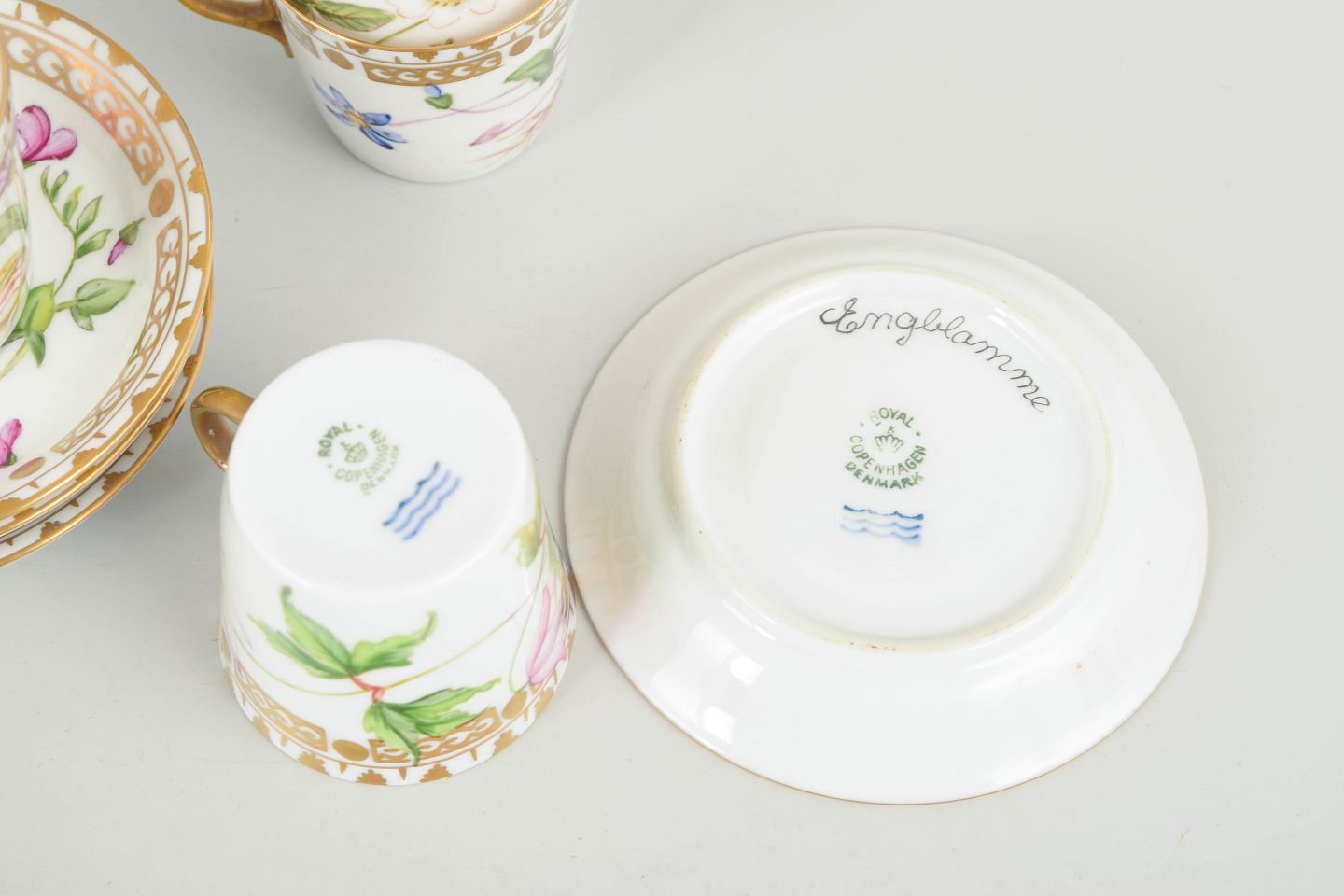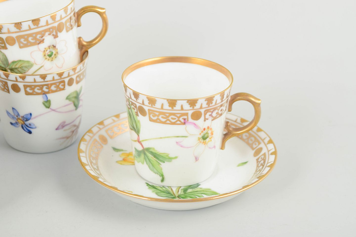 Royal Copenhagen, sæt på fire små kaffekopper med tilhørende underkopper.Porcelæn i Flora Danica-stil med håndmalede botaniske motiver og forgyldt kant.