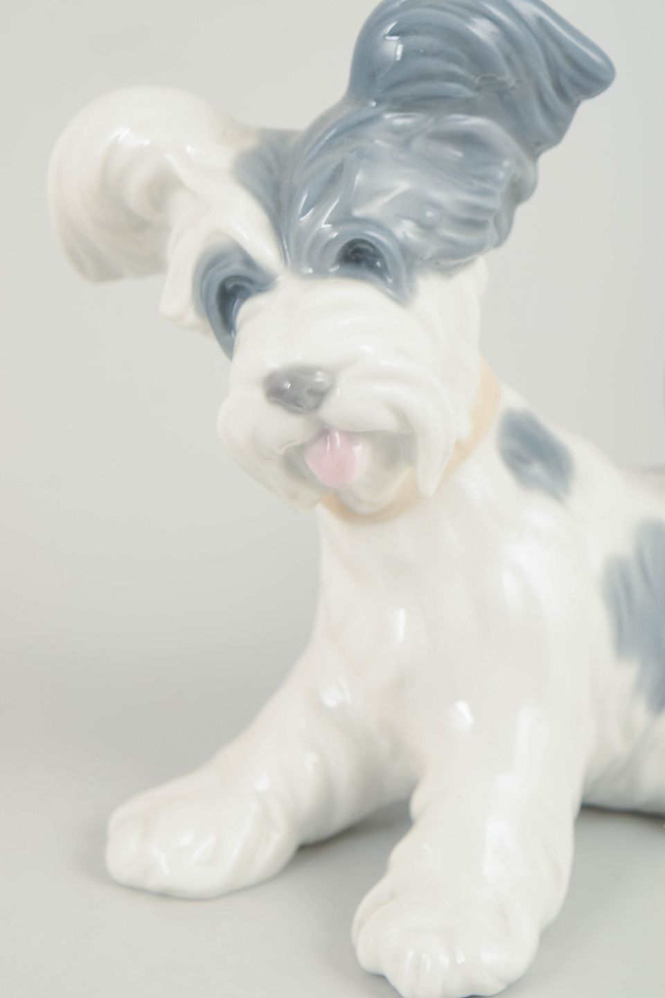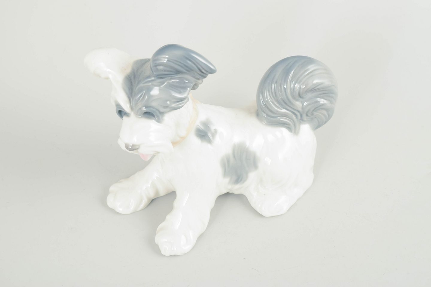 Lladró, Spanien, hundefigur.Naturalistisk porcelænsfigur forestillende en lille hund i siddende stilling, modelleret i hvid glasur med grå og lyseblå detaljer. Glat, blank overflade og bløde, afrundede former, typisk for Lladrós figurative produktion fra perioden.
