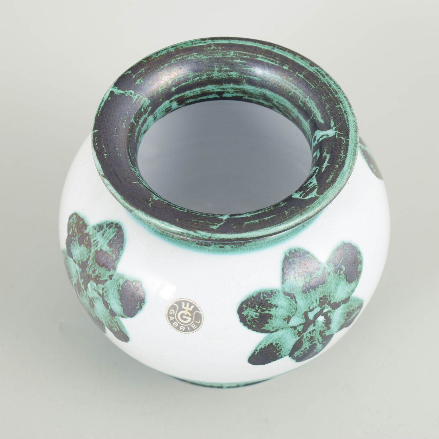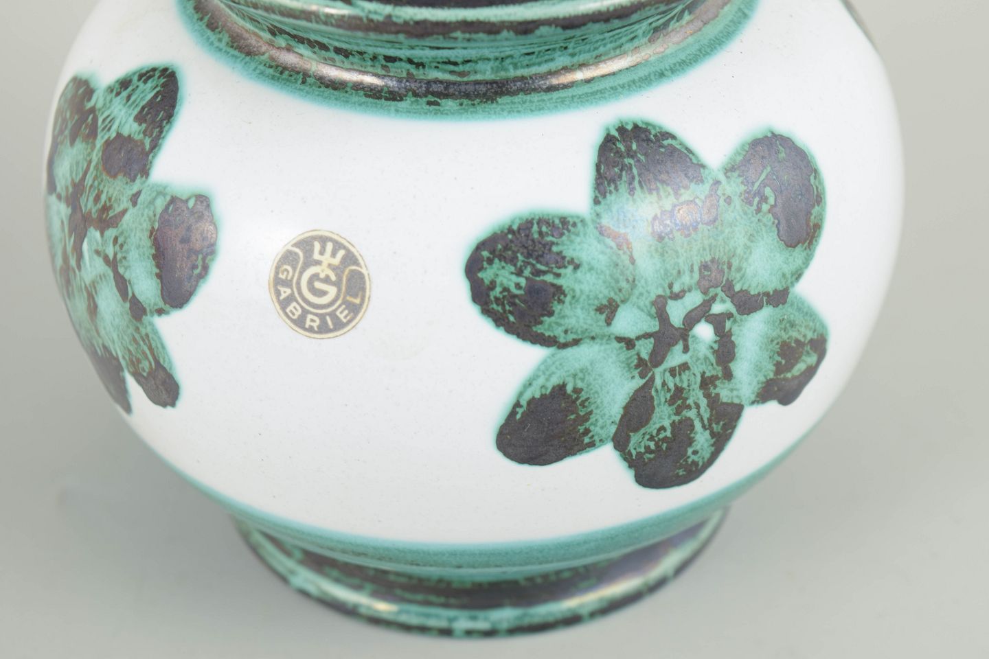 Gabriel Keramik, vase.Rundbuget vase i glaseret fajance med hvid bund og stiliseret blomsterdekoration i grønne og mørke toner. Dekoreret med kontrasterende grøn rand og fod. Fabriksmærkat med modelnummer 121.