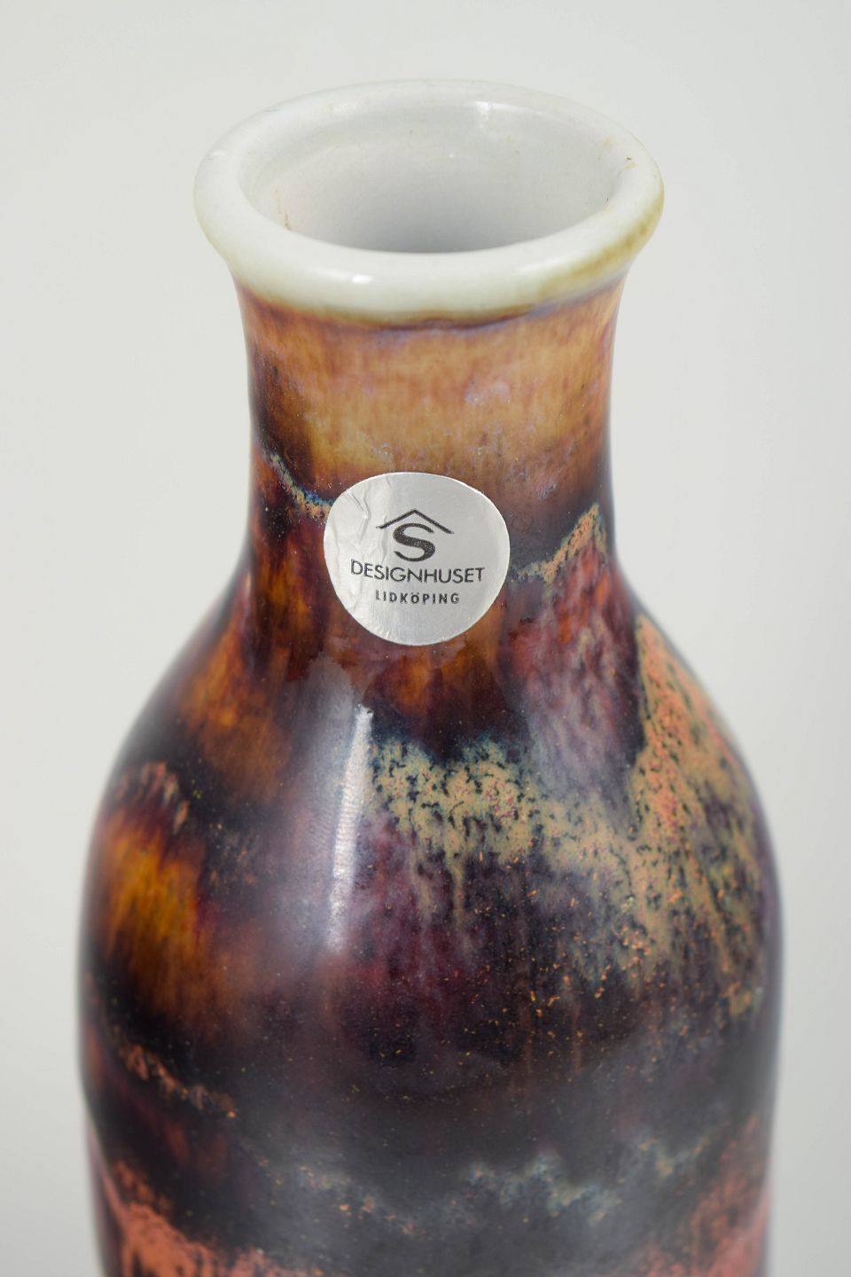 Carl-Harry Stålhane for Designhuset Linköping, unik vase.Slank, balusterformet vase i stentøj med levende, flerfarvet glasur i dybe brune, blålige og okkergule nuancer, afsluttet med lys kant ved mundingen.
