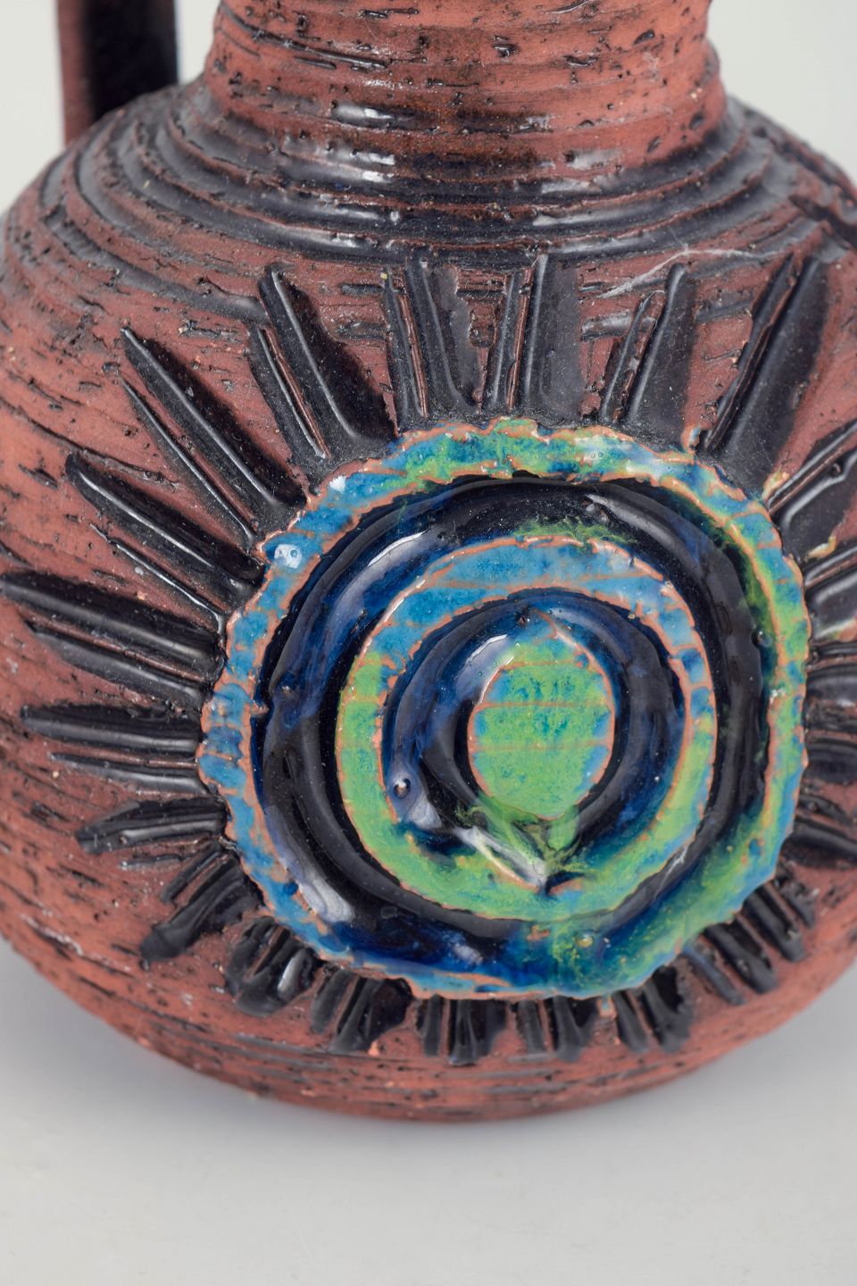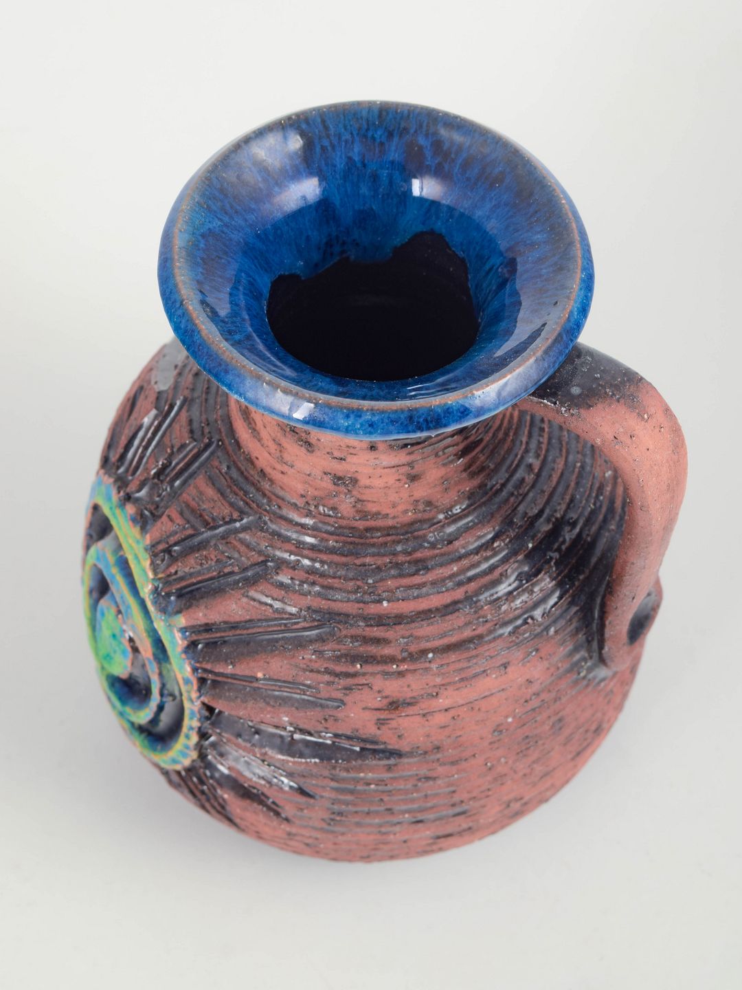 Ninnie Forsgren for Bromma Keramik, kande.Organisk formet kande i drejet stentøj med grov, rustik overflade i rødbrune toner samt dekorativt relief med cirkulært motiv i blå og grønne glasurer. Model 193.
