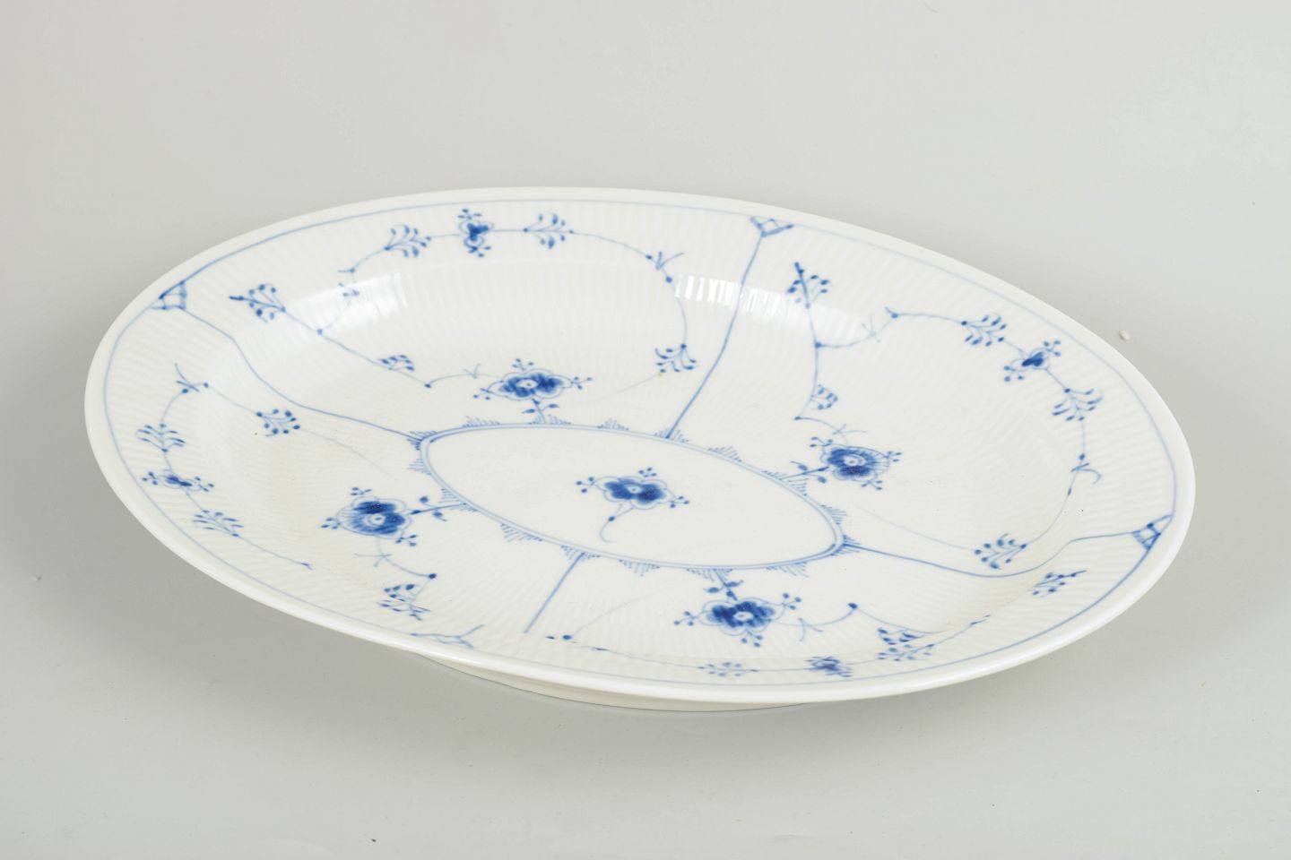 Royal Copenhagen, Musselmalet Riflet serveringsfad.Ovalt serveringsfad i porcelæn dekoreret i underglasurblåt med det klassiske Musselmalet Riflet-mønster. Model 1/99.