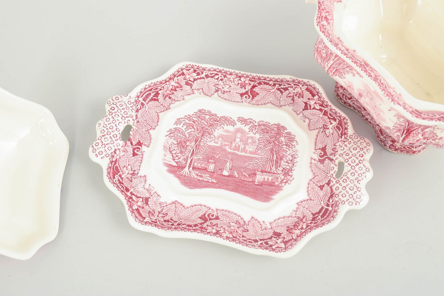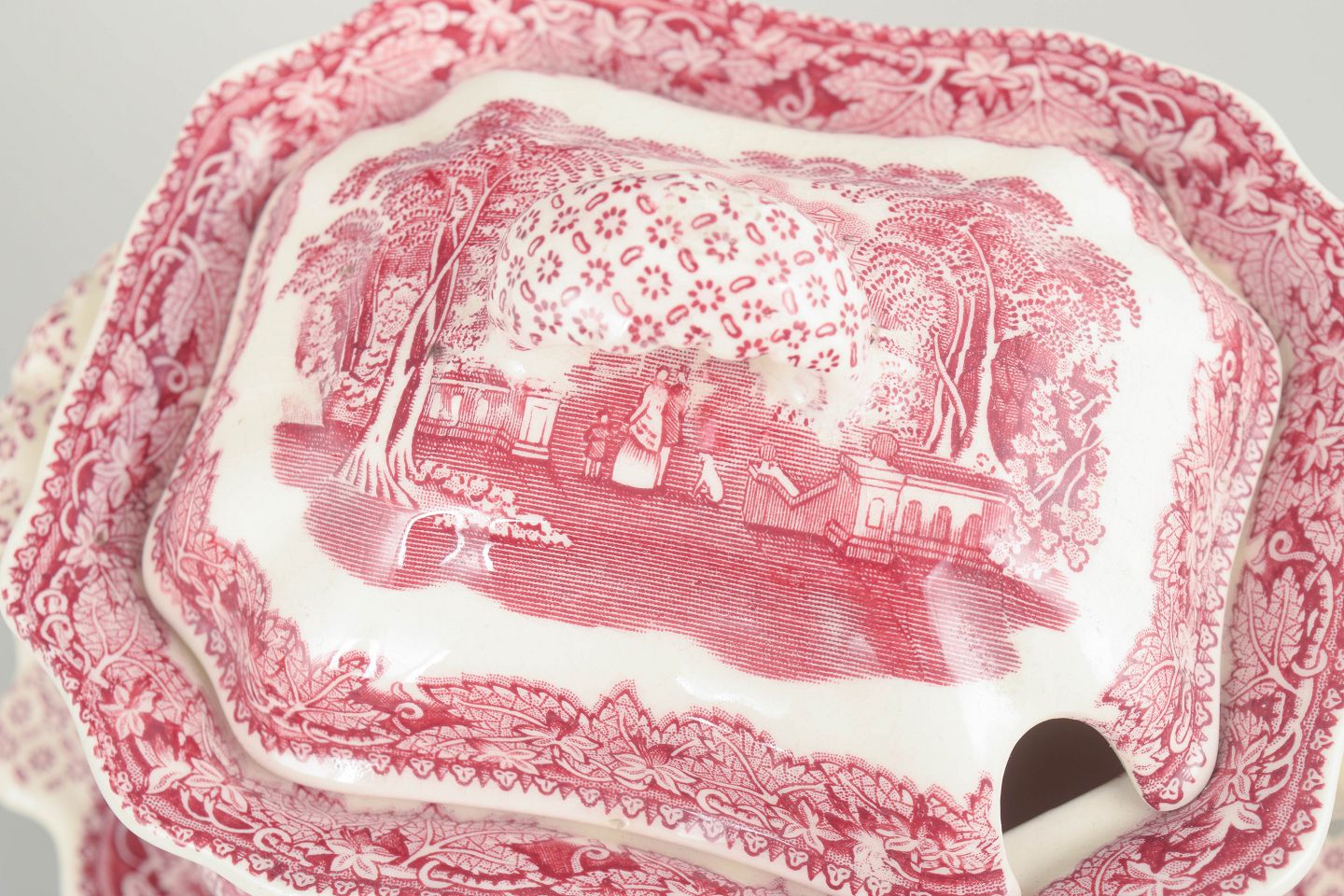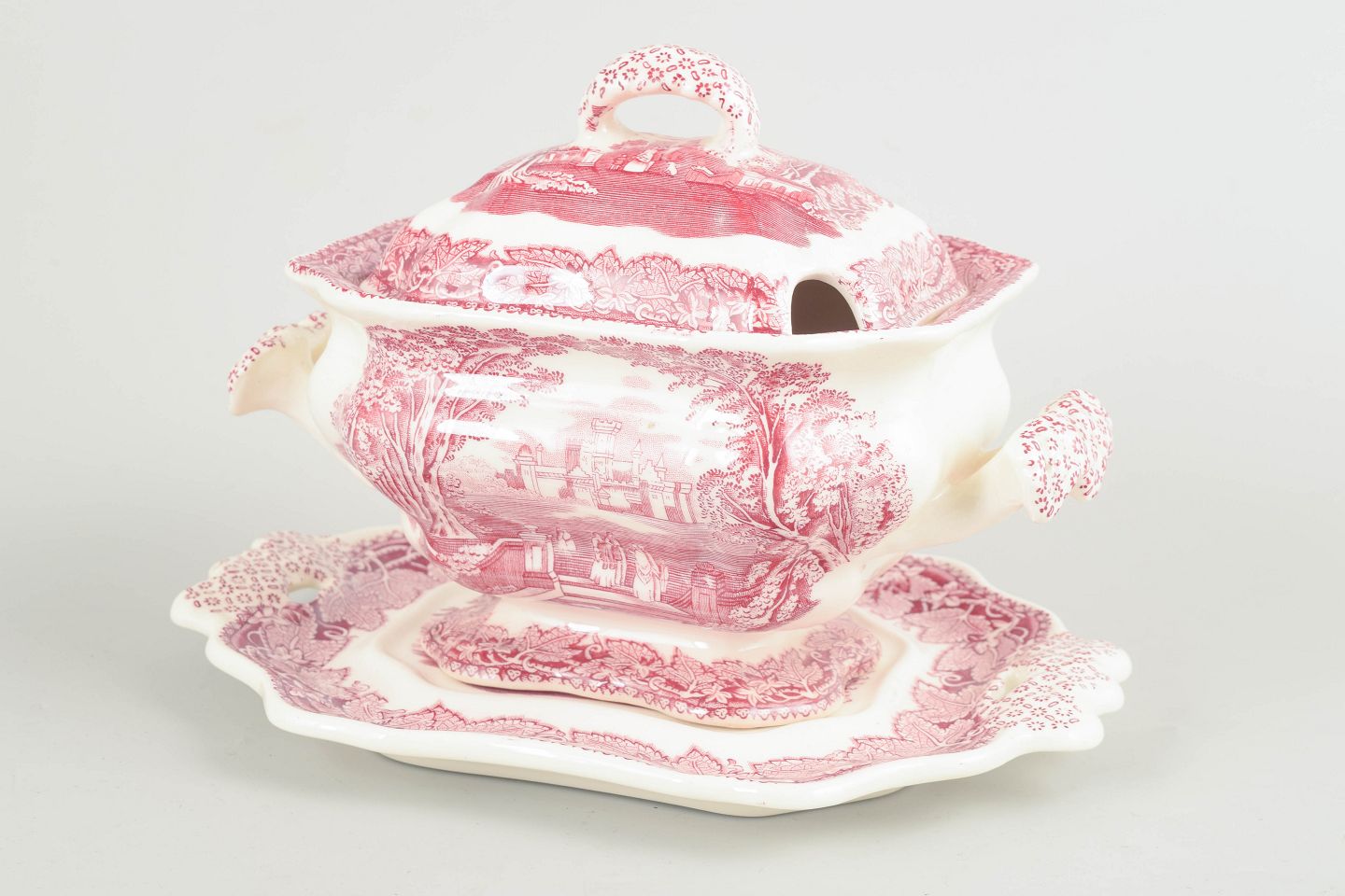 Mason’s, sauceskål med fad.Sauceskål i fajance fra Mason’s, dekoreret i rød transferware med landskabsmotiv og ornamentale borter.