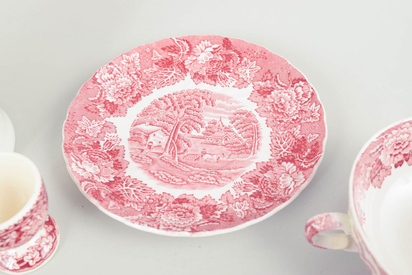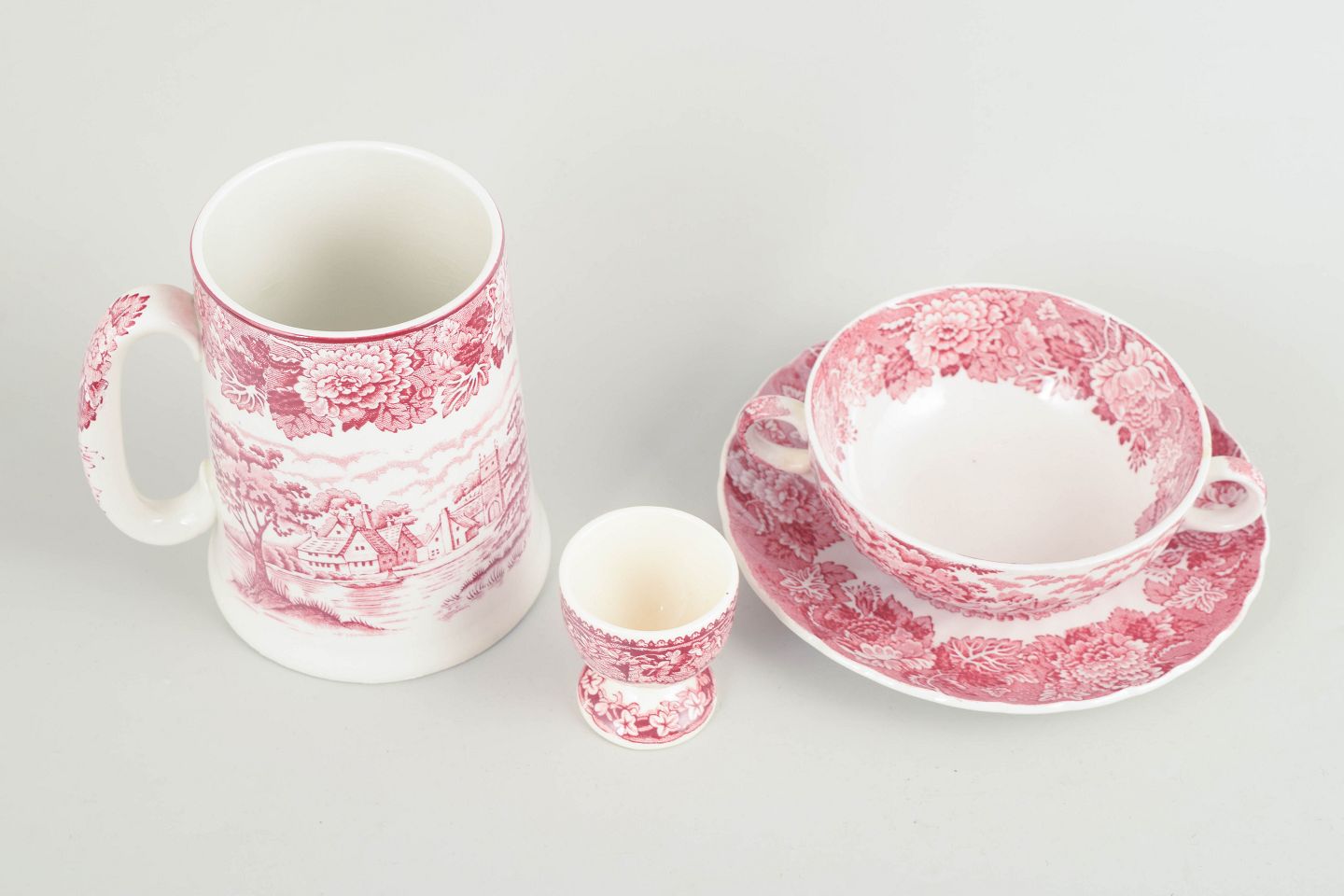 Mason’s, Wood & Sons, sæt med ølkrus, bouillonkop med underkop og æggebæger.Sæt i fajance fra Mason’s / Wood & Sons, dekoreret i rød transferware med landskabs- og ornamentmotiver.