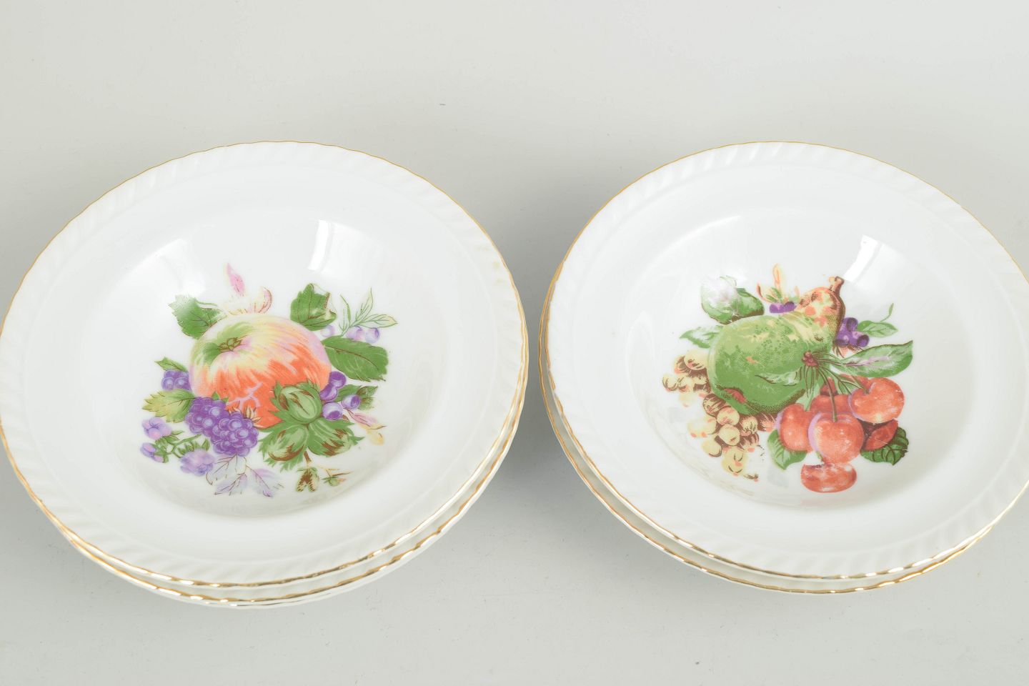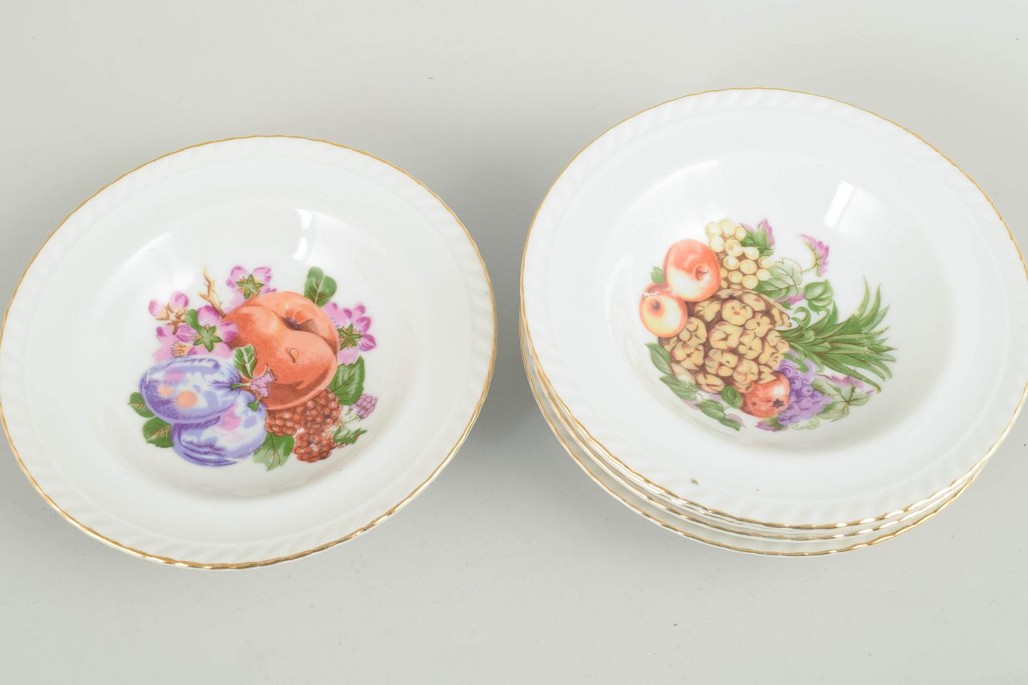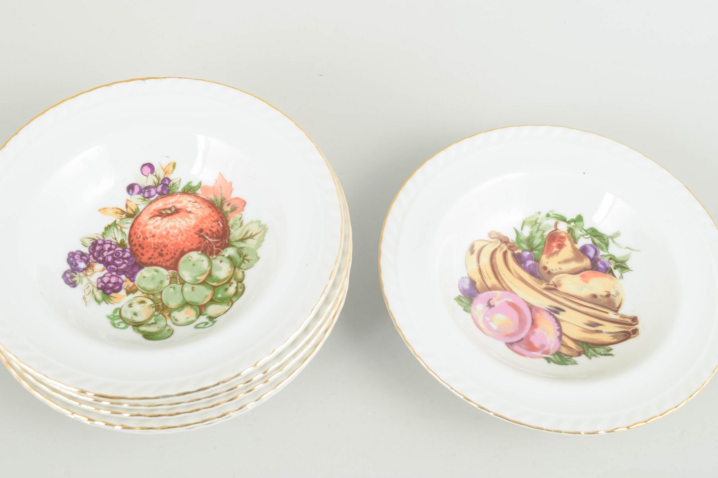 Sæt af seks porcelænsskåle dekoreret med polykrom frugtdekoration og guldkant. Klassisk europæisk bordporcelæn i tidstypisk mellemkrigsstil. Mærket på undersiden.