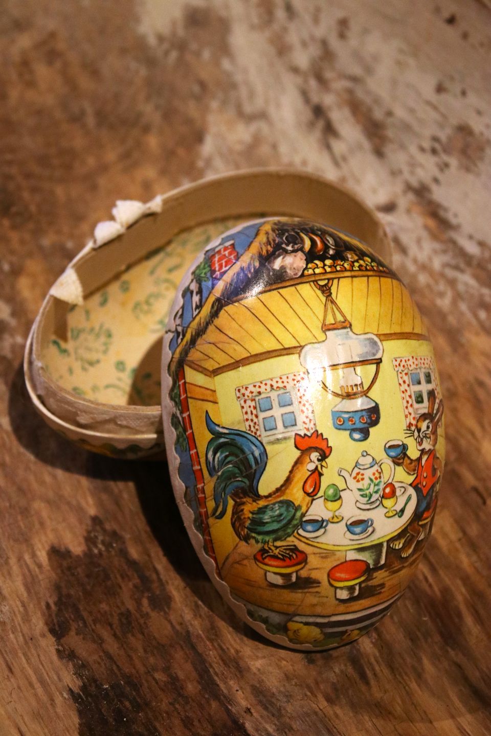 Gammelt vintage påskeæg i papmache med motiv af påskehare og høne der drikker te sammen...
