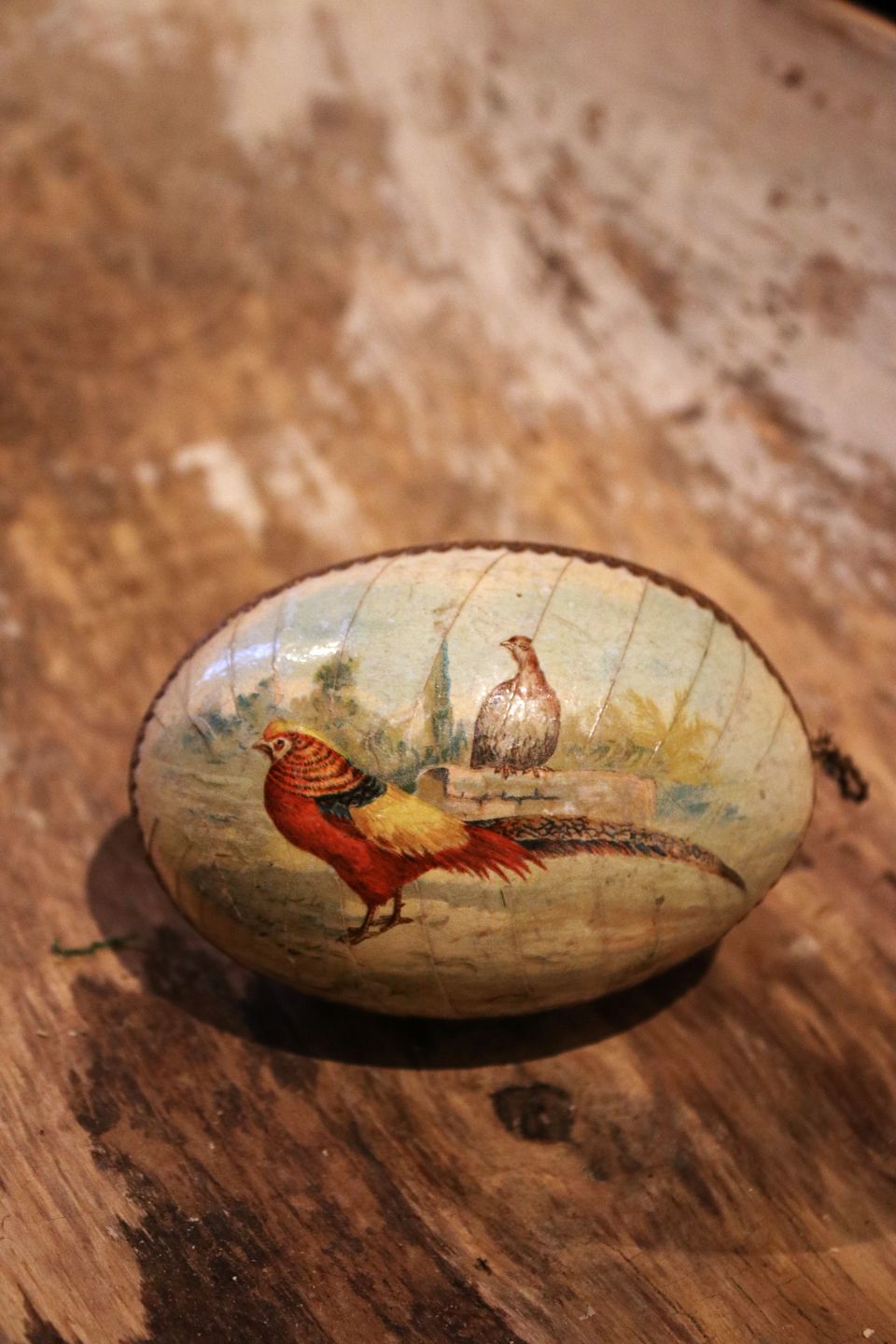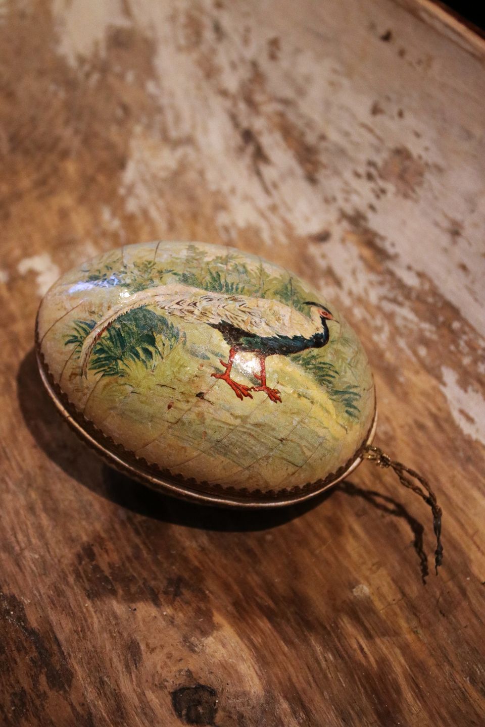 Gammelt påskeæg i træ med bemalet påfuglefra begyndelsen af 1900 tallet , dateret indeni år 1904...
