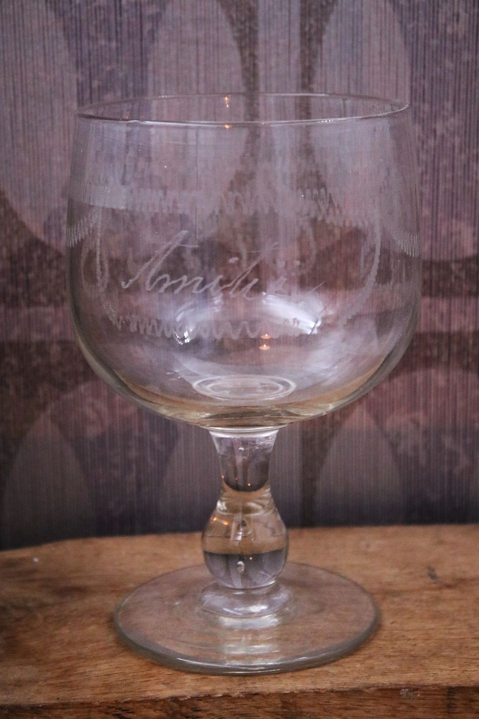 STORT antikt fransk mundblæst Souvenir glas med skrift "Amitie" som betyder Venskab. H: 18,5cm. Dia.:12cm.Dekorative som lys-glas eller blot til at drikke et godt glas rødvin af.