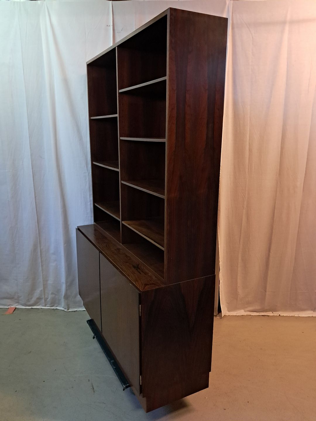 Omann Jun. 2 Delt reol i fineret palisander, fra 1960erne.Den har brugsspor og et lille hak i lågen.