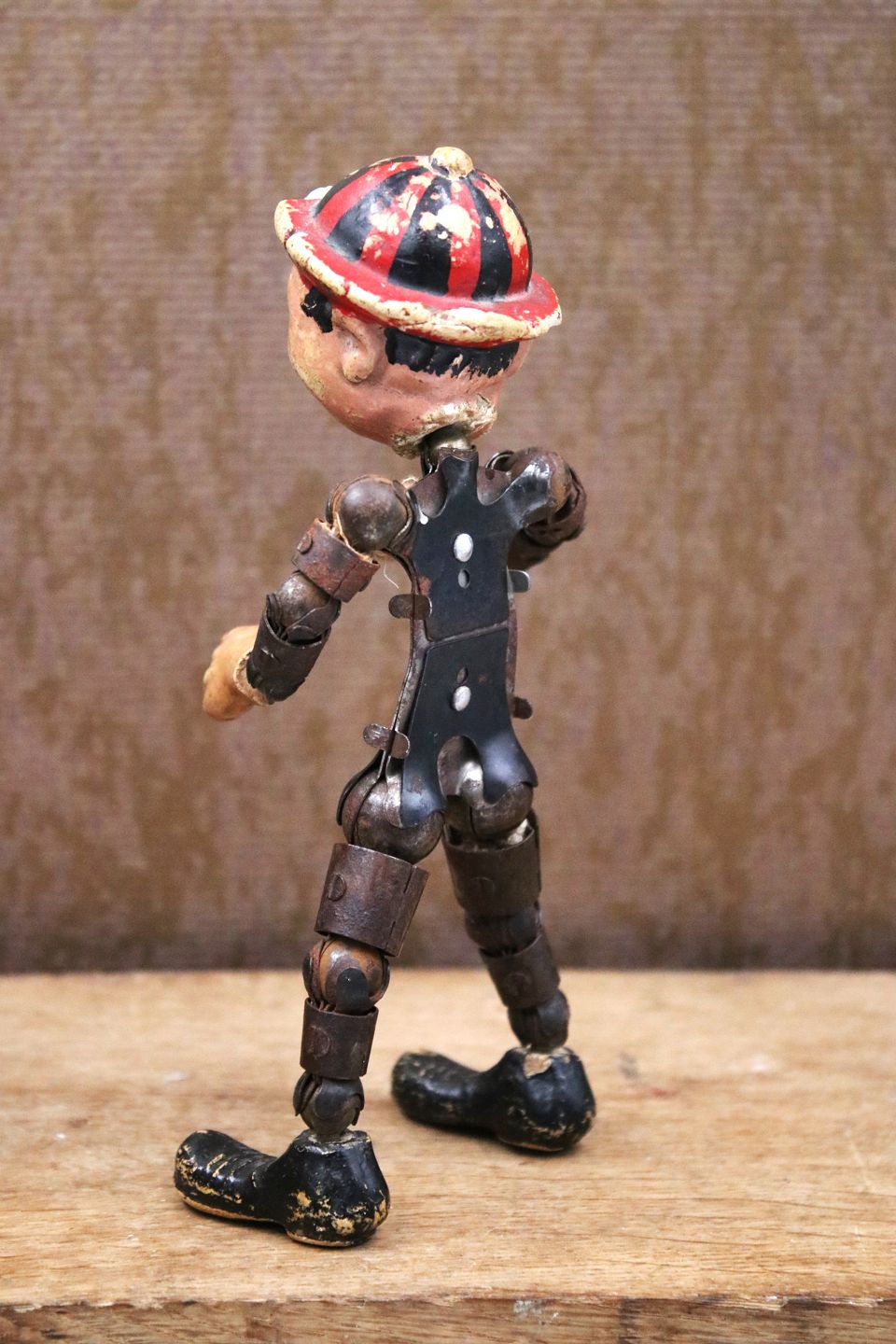 Sjov , gammel figur i metal og gips af lille mand.Krop , arme og ben er i metal som kan bøjes , hoved og hænder er i bemalet gips ( har lidt afslag ) Højde: 16,5cm.