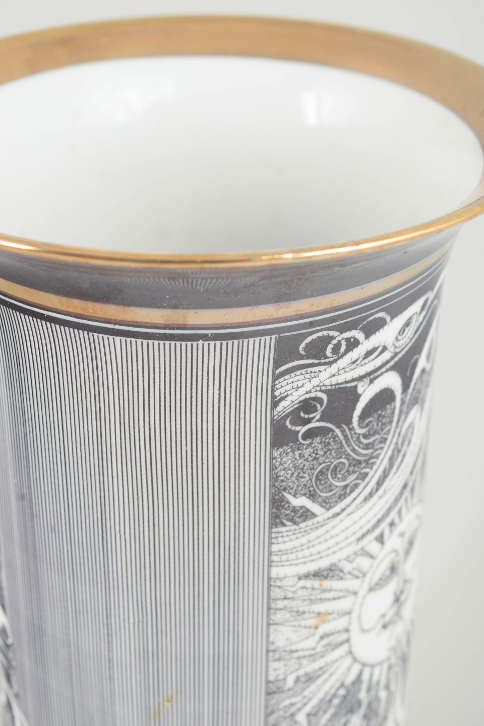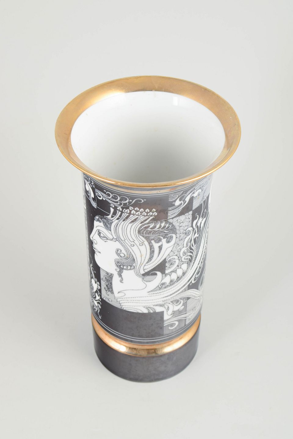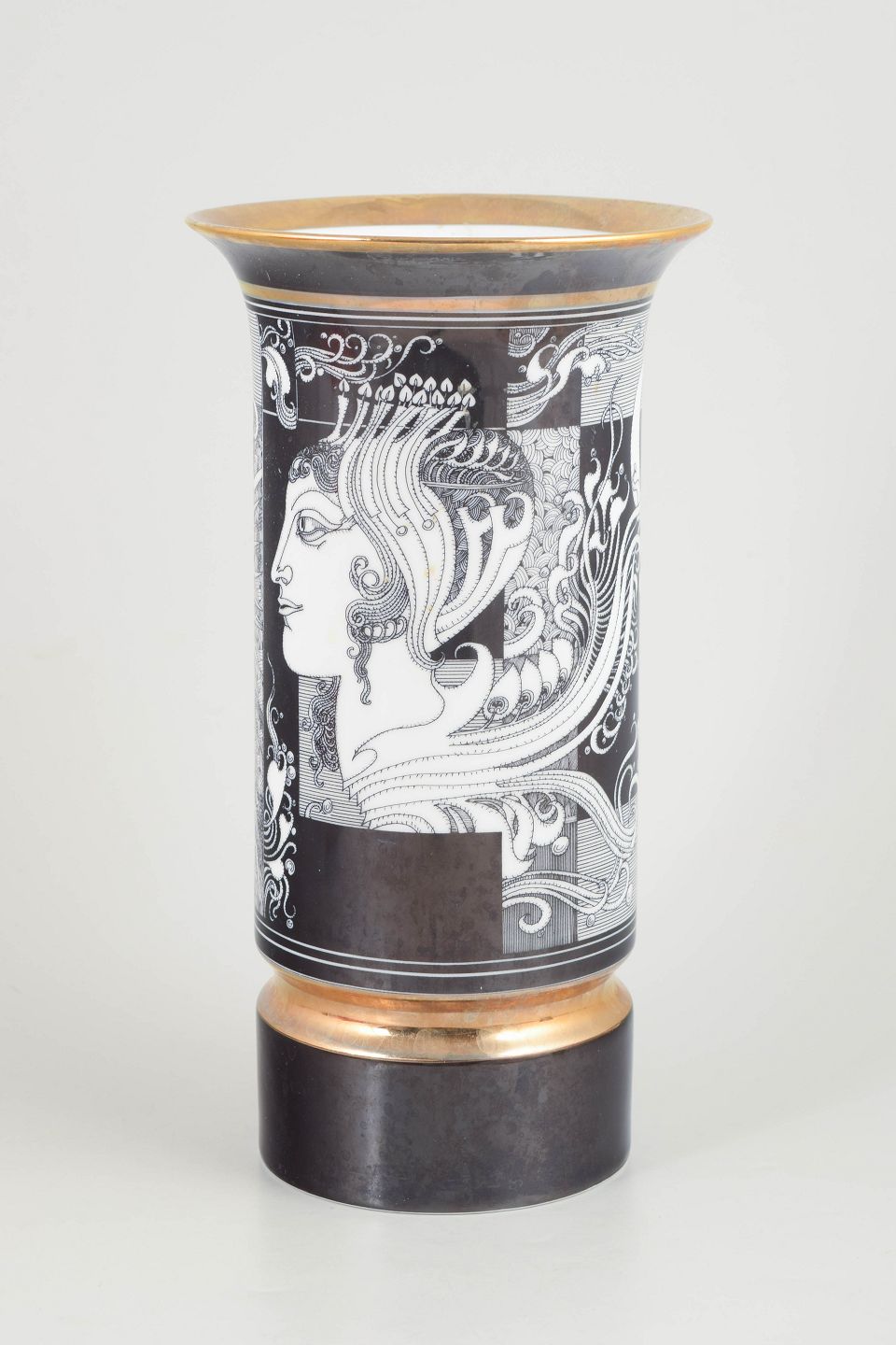Hollóháza Porcelænsfabrik, stor vase.Stor cylindrisk vase i porcelæn med sort og hvid grafisk dekoration samt gulddetaljer. Fremstillet i begrænset udgave.