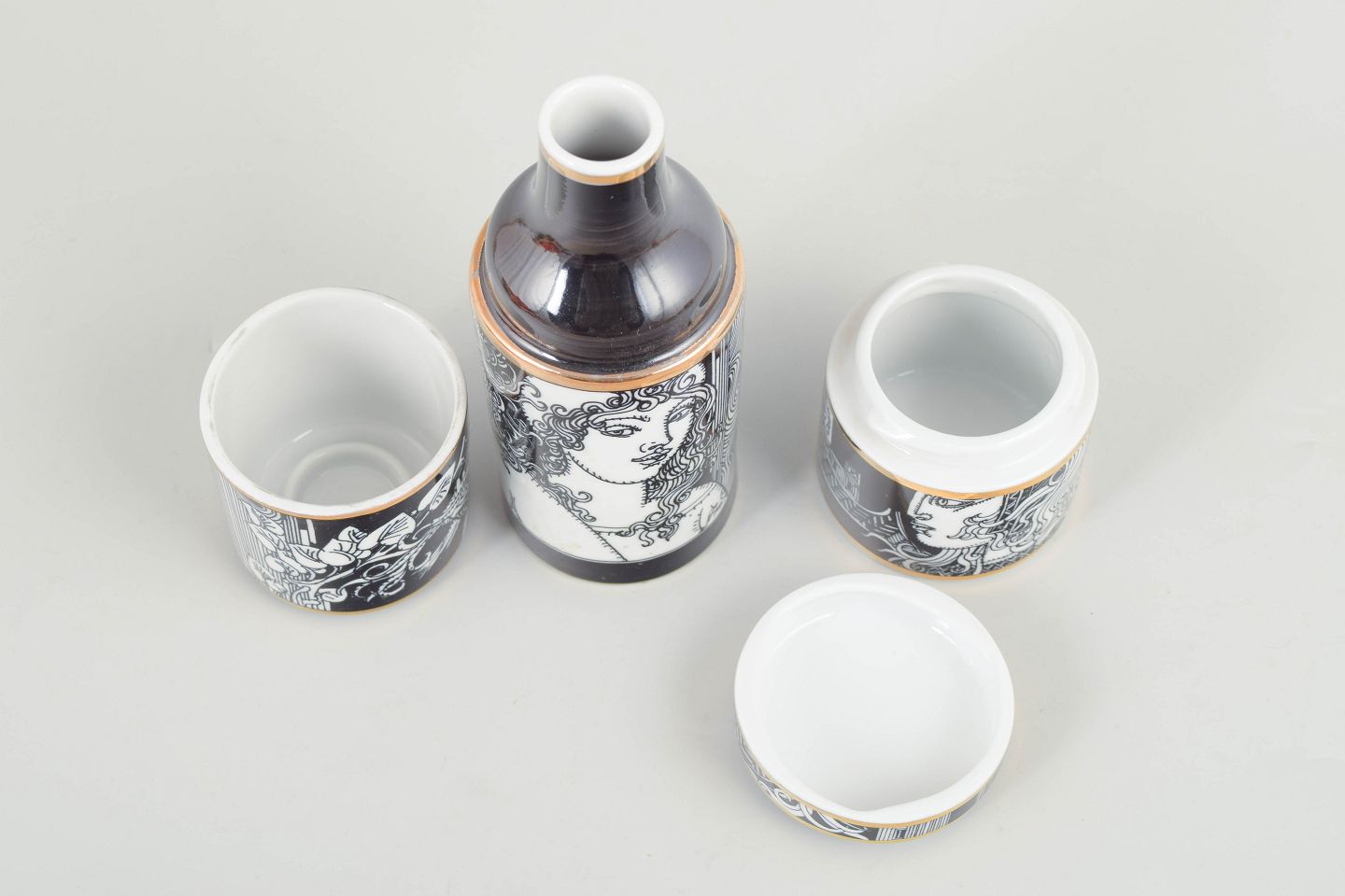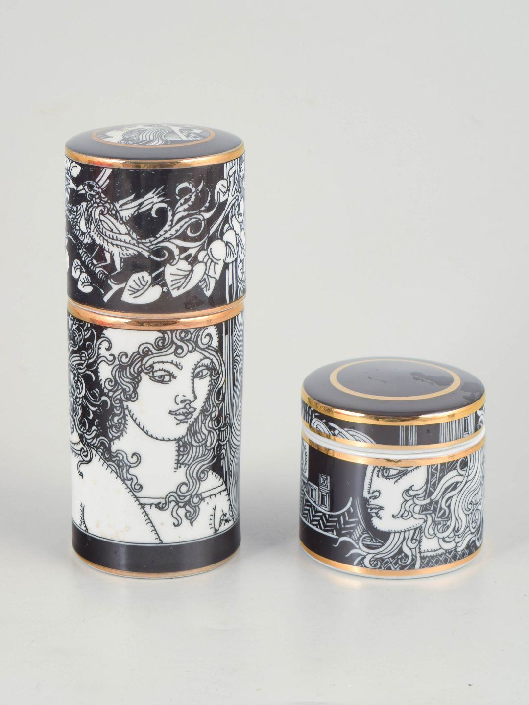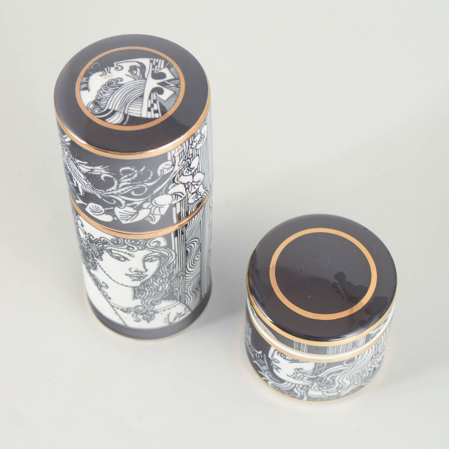 Hollóháza Porcelænsfabrik, 2 lågkrukker.To cylindriske lågkrukker i porcelæn med sort og hvid grafisk dekoration samt gulddetaljer. Produceret i begrænset udgave.