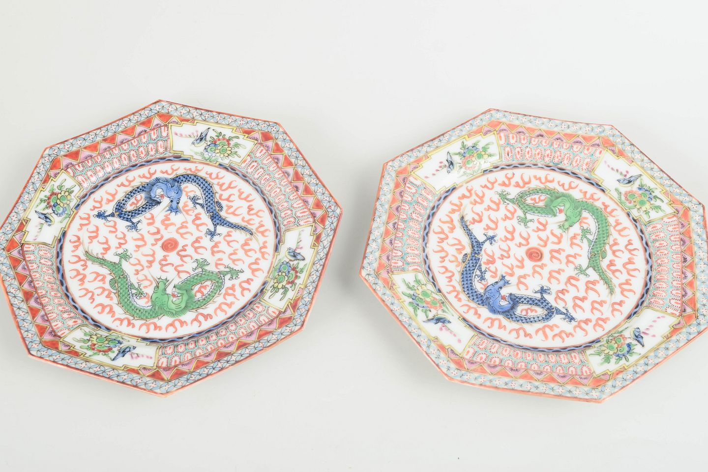 Kinesisk porcelænsproducent, sæt af 2 ottekantede tallerkener.Ottekantede tallerkener i håndmalet porcelæn med polykrom dekoration af drager og stiliserede mønstre i jernrøde, grønne og blå toner, indrammet af geometriske og florale borter. Udført til eksportmarkedet.