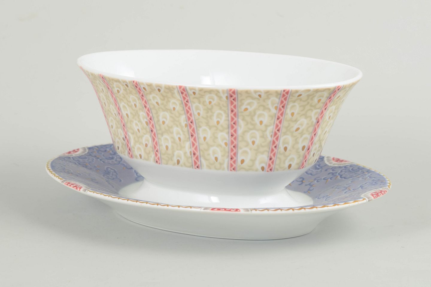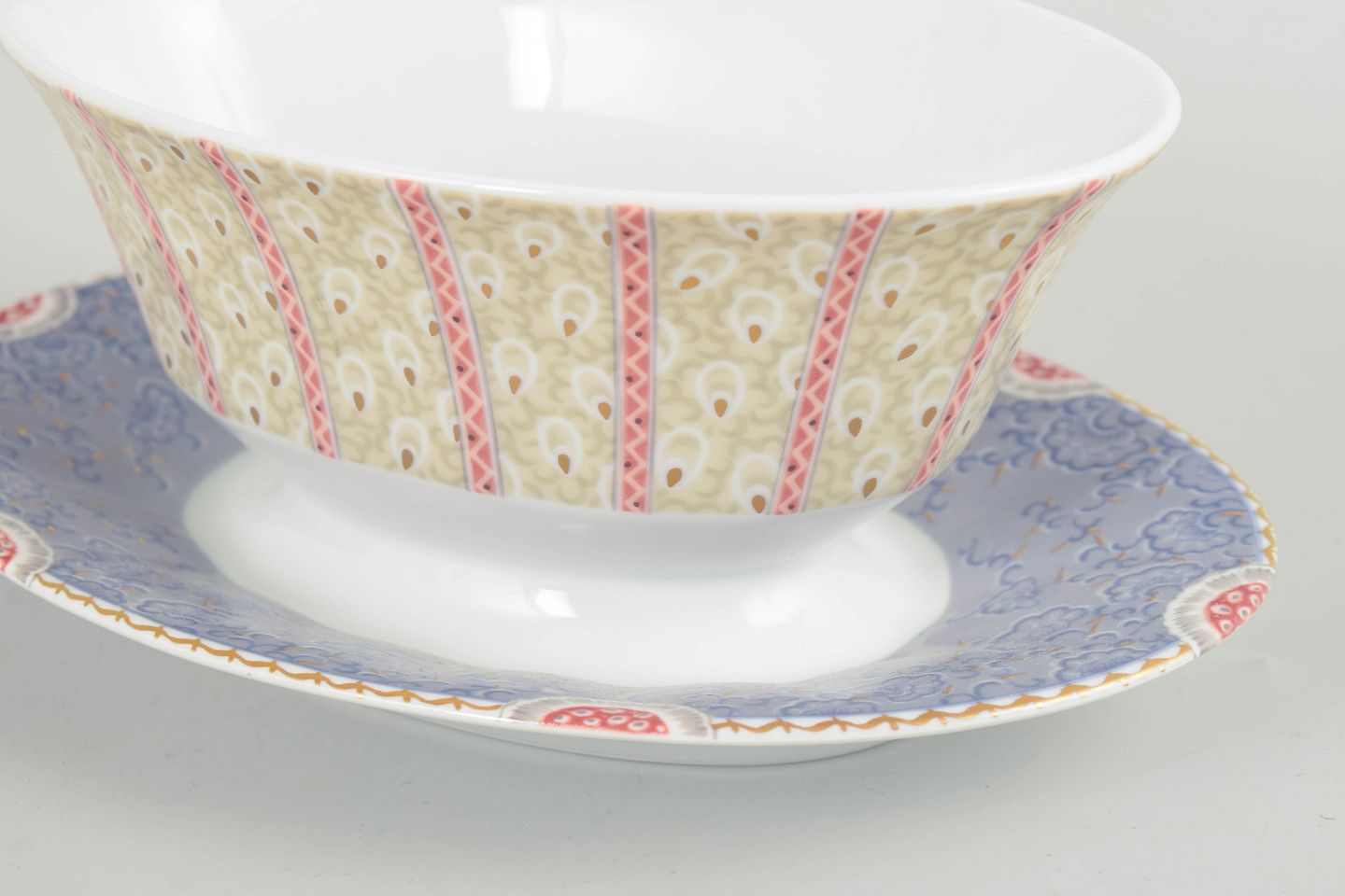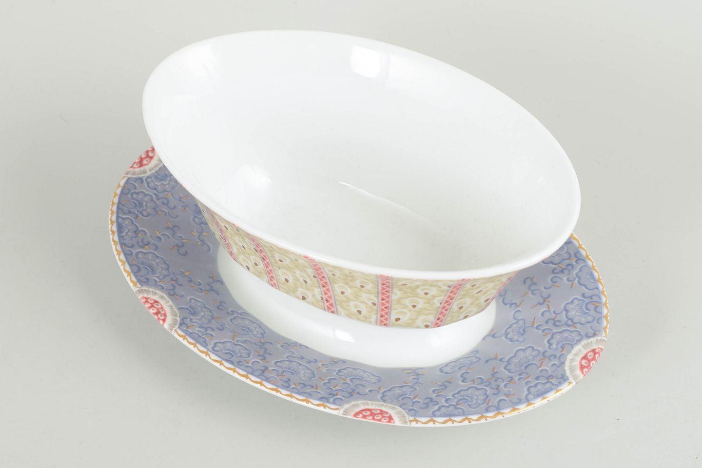 Royal Copenhagen, Fairytale saucekande.Elegant saucekande i hvidt porcelæn dekoreret med Fairytale-mønstre i bløde pastelfarver og fine detaljer. Modellen er fremstillet i perioden 1992–1999 og er udført i 1. sortering.